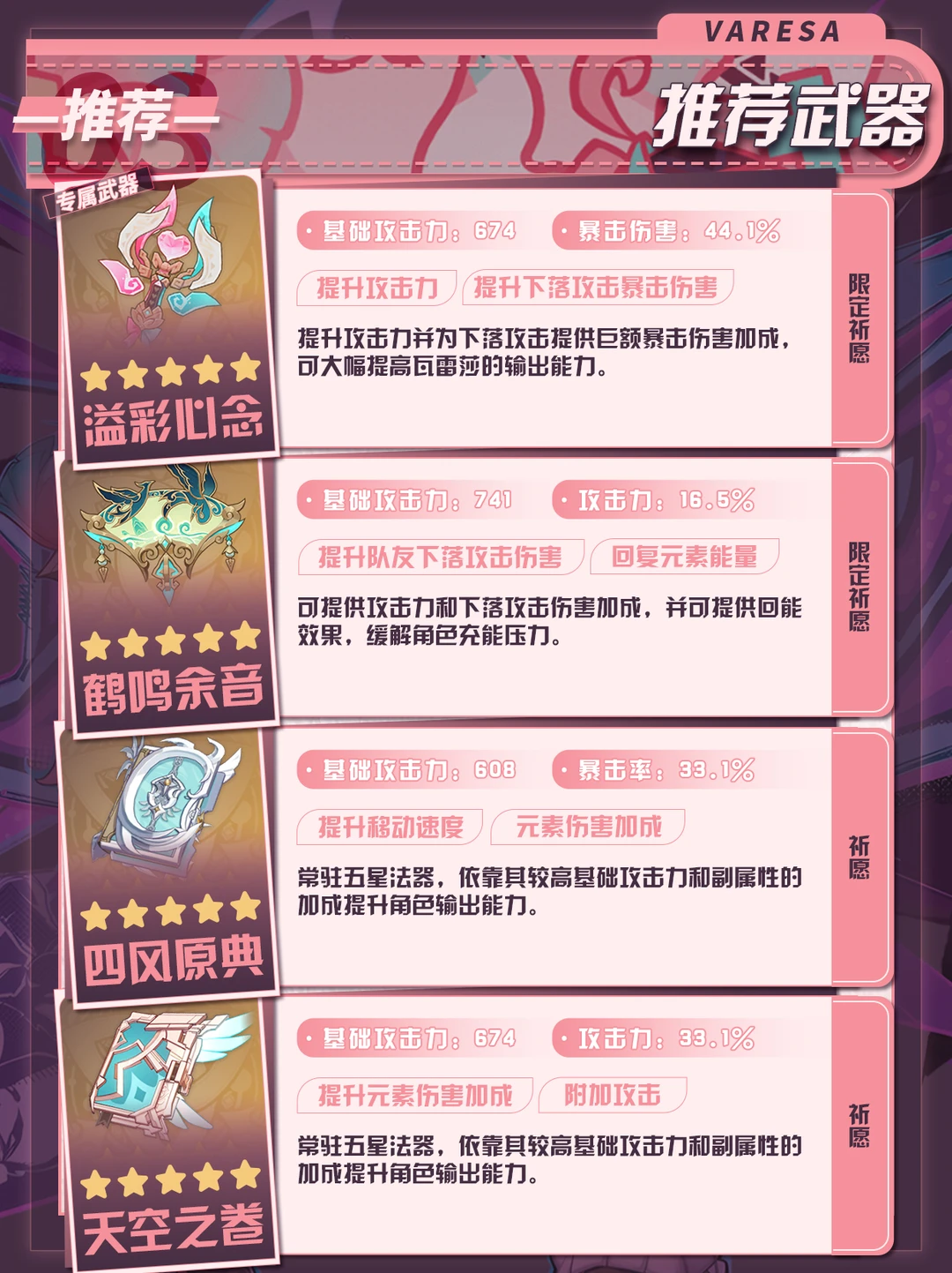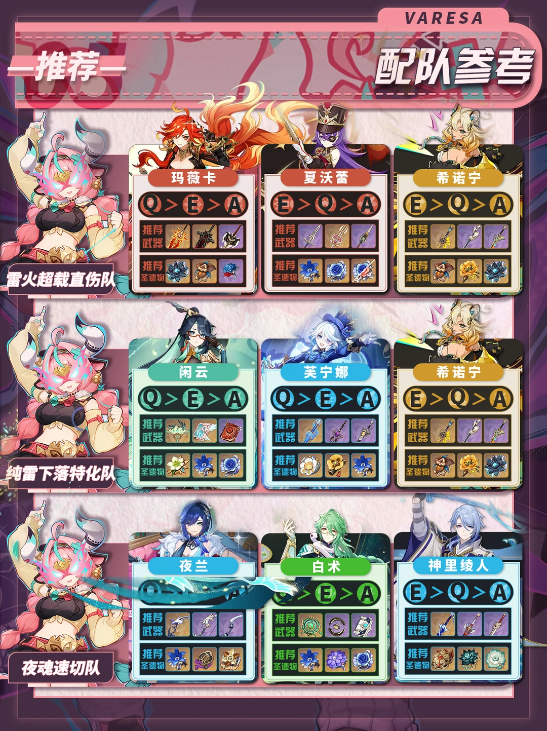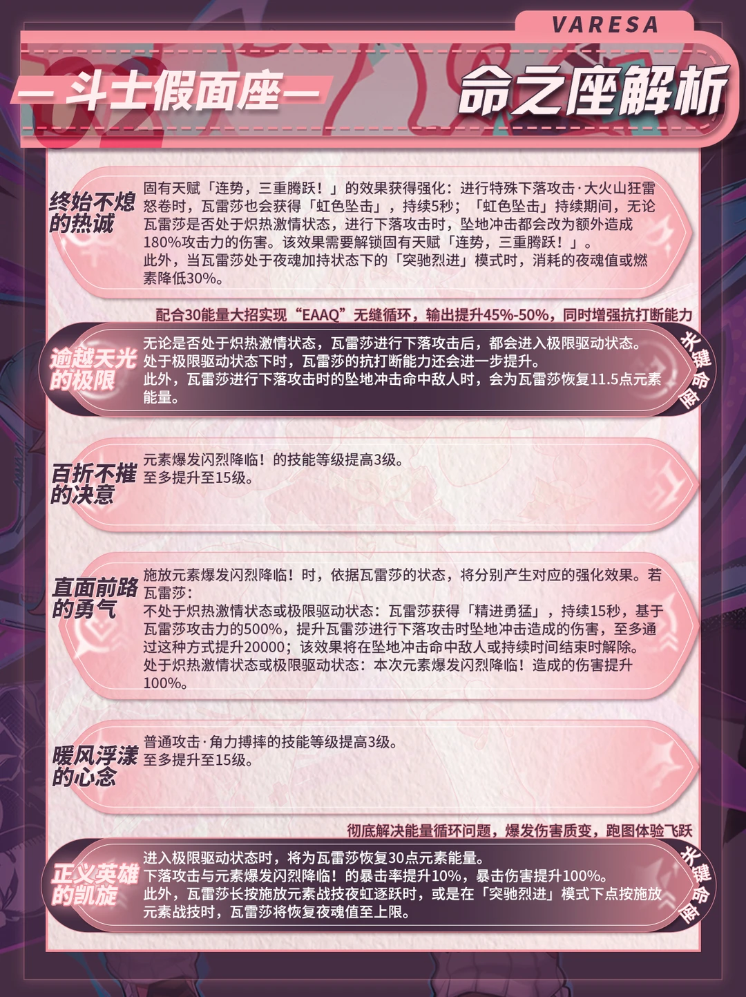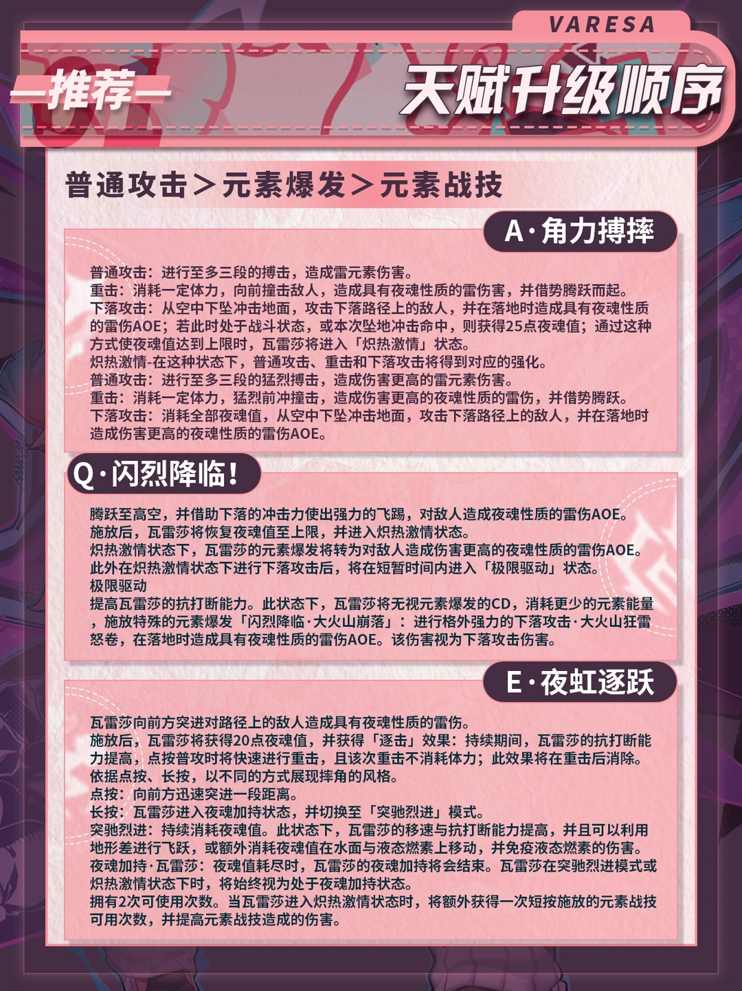 【月之三】瓦蕾莎角色攻略 原神uid:240018896 瓦蕾莎角色攻略 【天赋升级顺序】 普通攻击>元素爆发>元素战技 【命之座解析】 逾越天光的极限:无论是否处于炽热激情状态,瓦雷莎进行下落攻击后,都会进入极限驱动状态。处于极限驱动状态下时,瓦雷莎的抗打断能力还会进一步提升。此外,瓦雷莎进行下落攻击时的坠地冲击命中敌人时,会为瓦雷莎恢复11.5点元素能量。 正义英雄的凯旋:进入极限驱动状态时,将为瓦雷莎恢复30点元素能量。下落攻击与元素爆发闪烈降临!的暴击率提升10%,暴击伤害提升100%。此外,瓦雷莎长按施放元素战技夜虹逐跃时,或是在「突驰烈进」模式下点按施放元素战技时,瓦雷莎将恢复夜魂值至上限。 【推荐武器】 溢彩心念 鹤鸣余音 四风原典 天空之卷 【推荐圣遗物】 长夜之誓:提供巨额下落攻击伤害加成2件套效果:下落攻击造成的伤害提升25%4件套效果:装备者的下落攻击/重击/元素战技命中敌人后,获得1/2/2层「永照的流辉」,由下落攻击、重击或元素战技产生的该效果分别每秒至多触发一次。永照的流辉:下落攻击造成的伤害提升15%独持续G秒,至多叠加5层,每层持续时间独立计算 黑曜秘典:提供一定的伤害加成高额暴击率加成2件套效果:装备者处于夜魂加持状态,并且在场上时,造成的伤害提高15%4件套效果:装备者在场上消耗1点夜魂值后暴击率提高40%,持续6秒。该效果每1秒至多触发一次 【配队参考】 雷火超载直伤队:瓦蕾莎+玛薇卡+夏沃蕾+希诺宁 纯2雷下落特化队:瓦蕾莎+闲云+芙宁娜+希诺宁 夜魂速切队:瓦蕾莎+夜兰+白术+神里绫人