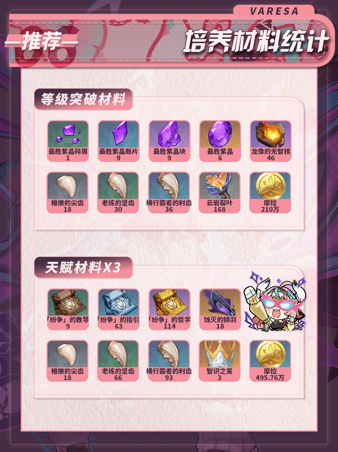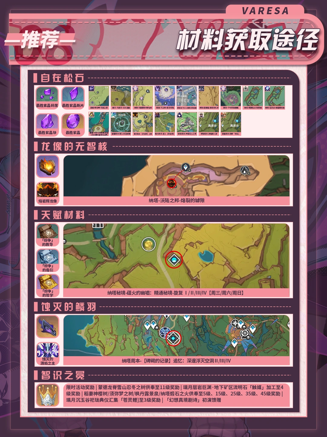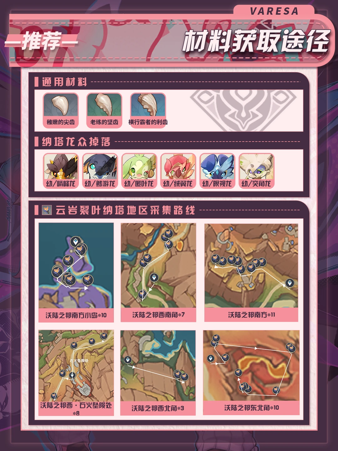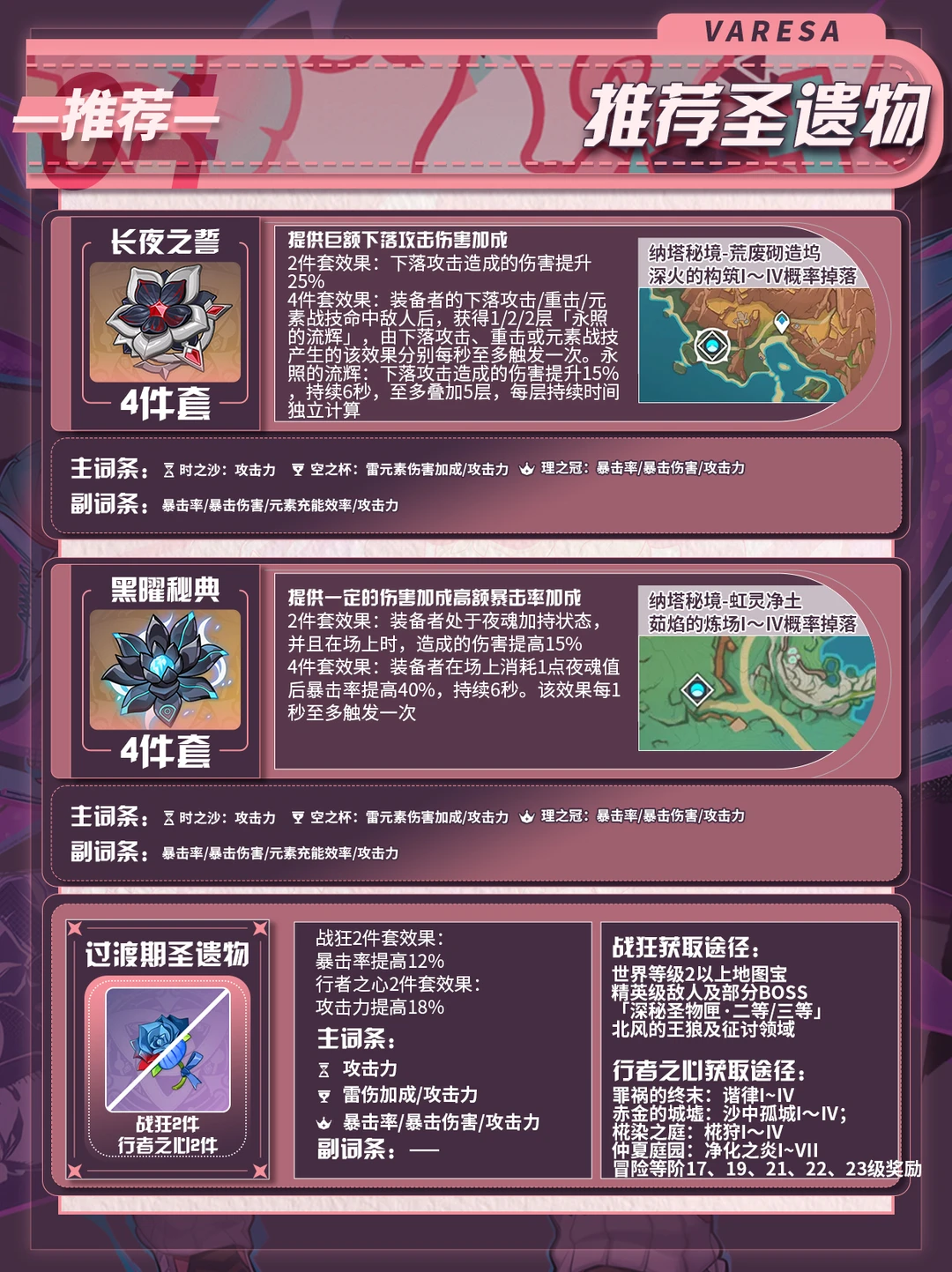 【月之三】瓦蕾莎角色攻略 原神uid:240018896 瓦蕾莎角色攻略 【天赋升级顺序】 普通攻击>元素爆发>元素战技 【命之座解析】 逾越天光的极限:无论是否处于炽热激情状态,瓦雷莎进行下落攻击后,都会进入极限驱动状态。处于极限驱动状态下时,瓦雷莎的抗打断能力还会进一步提升。此外,瓦雷莎进行下落攻击时的坠地冲击命中敌人时,会为瓦雷莎恢复11.5点元素能量。 正义英雄的凯旋:进入极限驱动状态时,将为瓦雷莎恢复30点元素能量。下落攻击与元素爆发闪烈降临!的暴击率提升10%,暴击伤害提升100%。此外,瓦雷莎长按施放元素战技夜虹逐跃时,或是在「突驰烈进」模式下点按施放元素战技时,瓦雷莎将恢复夜魂值至上限。 【推荐武器】 溢彩心念 鹤鸣余音 四风原典 天空之卷 【推荐圣遗物】 长夜之誓:提供巨额下落攻击伤害加成2件套效果:下落攻击造成的伤害提升25%4件套效果:装备者的下落攻击/重击/元素战技命中敌人后,获得1/2/2层「永照的流辉」,由下落攻击、重击或元素战技产生的该效果分别每秒至多触发一次。永照的流辉:下落攻击造成的伤害提升15%独持续G秒,至多叠加5层,每层持续时间独立计算 黑曜秘典:提供一定的伤害加成高额暴击率加成2件套效果:装备者处于夜魂加持状态,并且在场上时,造成的伤害提高15%4件套效果:装备者在场上消耗1点夜魂值后暴击率提高40%,持续6秒。该效果每1秒至多触发一次 【配队参考】 雷火超载直伤队:瓦蕾莎+玛薇卡+夏沃蕾+希诺宁 纯2雷下落特化队:瓦蕾莎+闲云+芙宁娜+希诺宁 夜魂速切队:瓦蕾莎+夜兰+白术+神里绫人