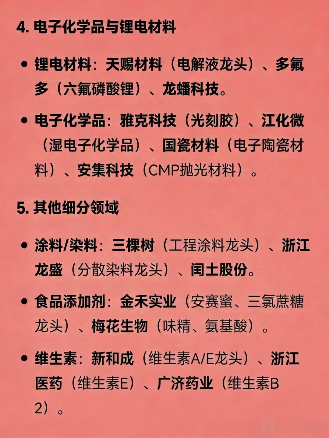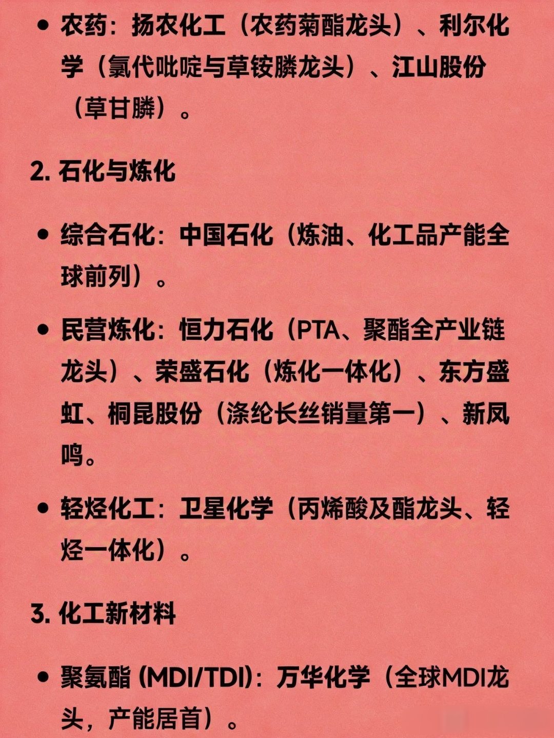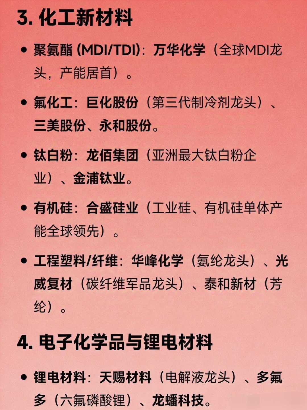 化工概念细分领域龙头汇总1.基础化工与农化磷化工:云天化(磷肥龙头)、兴发集团(草甘膦、湿法磷酸)、湖北宜化(磷肥、尿素)、川恒股份(湿法磷酸)、川发龙蟒(工业级磷酸一铵)。煤化工:华鲁恒升(煤头尿素、DMF龙头)、宝丰能源(煤制烯烃龙头)、鲁西化工(化肥、PVC)。纯碱/烧碱:三友化工(纯碱龙头)、山东海化(溴素、纯碱)、远兴能源(天然碱)。钾肥:盐湖股份(国内最大钾肥生产商)、亚钾国际(亚洲单体储量最大)。农药:扬农化工(农药菊酯龙头)、利尔化学(氯代吡啶与草铵膦龙头)、江山股份(草甘膦)。2.石化与炼化综合石化:中国石化(炼油、化工品产能全球前列)。民营炼化:恒力石化(PTA、聚酯全产业链龙头)、荣盛石化(炼化一体化)、东方盛虹、桐昆股份(涤纶长丝销量第一)、新凤鸣。轻烃化工:卫星化学(丙烯酸及酯龙头、轻烃一体化)。3.化工新材料聚氨酯(MDI/TDI):万华化学(全球MDI龙头,产能居首)。氟化工:巨化股份(第三代制冷剂龙头)、三美股份、永和股份。钛白粉:龙佰集团(亚洲最大钛白粉企业)、金浦钛业。有机硅:合盛硅业(工业硅、有机硅单体产能全球领先)。工程塑料/纤维:华峰化学(氨纶龙头)、光威复材(碳纤维军品龙头)、泰和新材(芳纶)。4.电子化学品与锂电材料锂电材料:天赐材料(电解液龙头)、多氟多(六氟磷酸锂)、龙蟠科技。电子化学品:雅克科技(光刻胶)、江化微(湿电子化学品)、国瓷材料(电子陶瓷材料)、安集科技(CMP抛光材料)。5.其他细分领域涂料/染料:三棵树(工程涂料龙头)、浙江龙盛(分散染料龙头)、闰土股份。食品添加剂:金禾实业(安赛蜜、三氯蔗糖龙头)、梅花生物(味精、氨基酸)。维生素:新和成(维生素A/E龙头)、浙江医药(维生素E)、广济药业(维生素B2)。