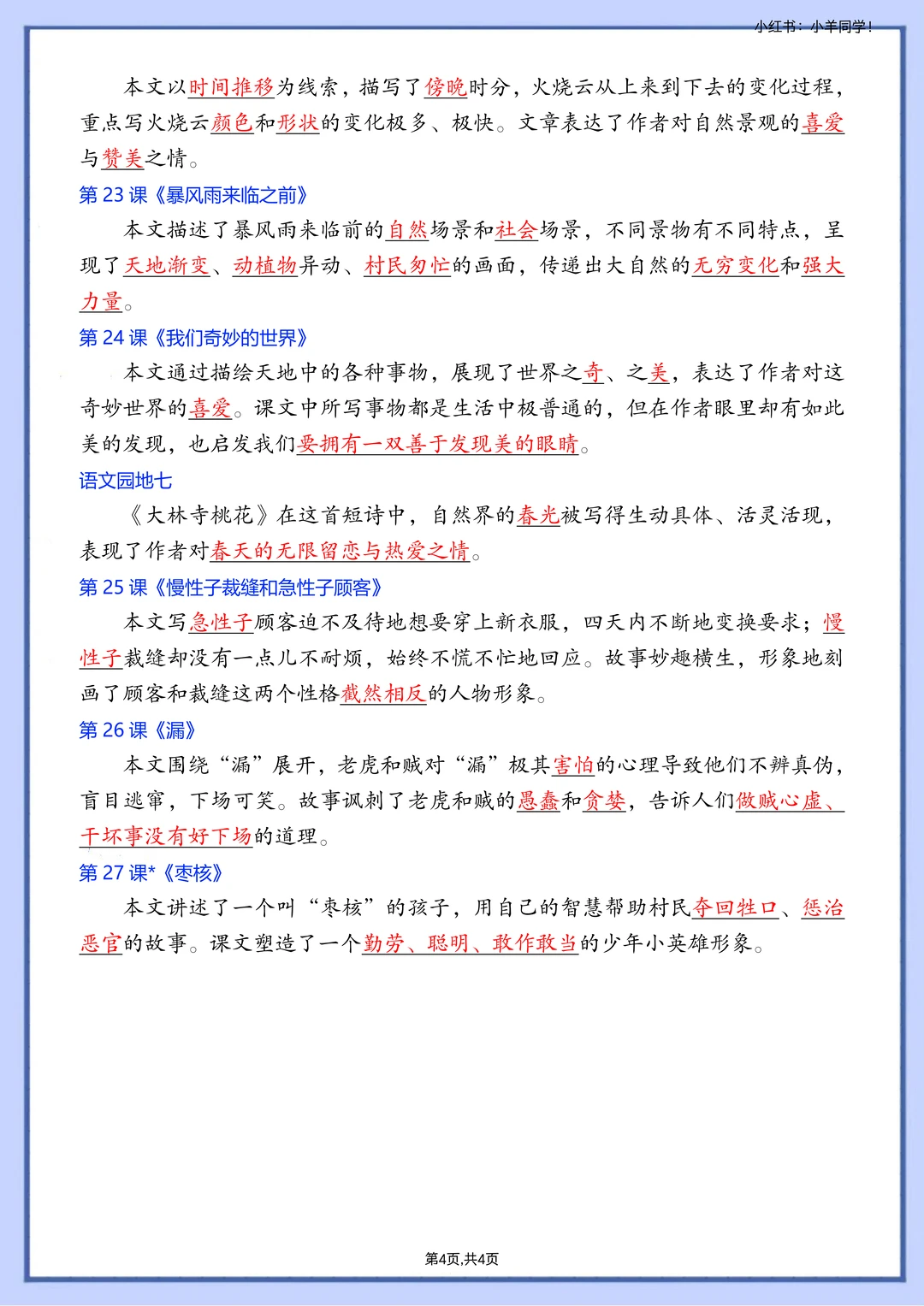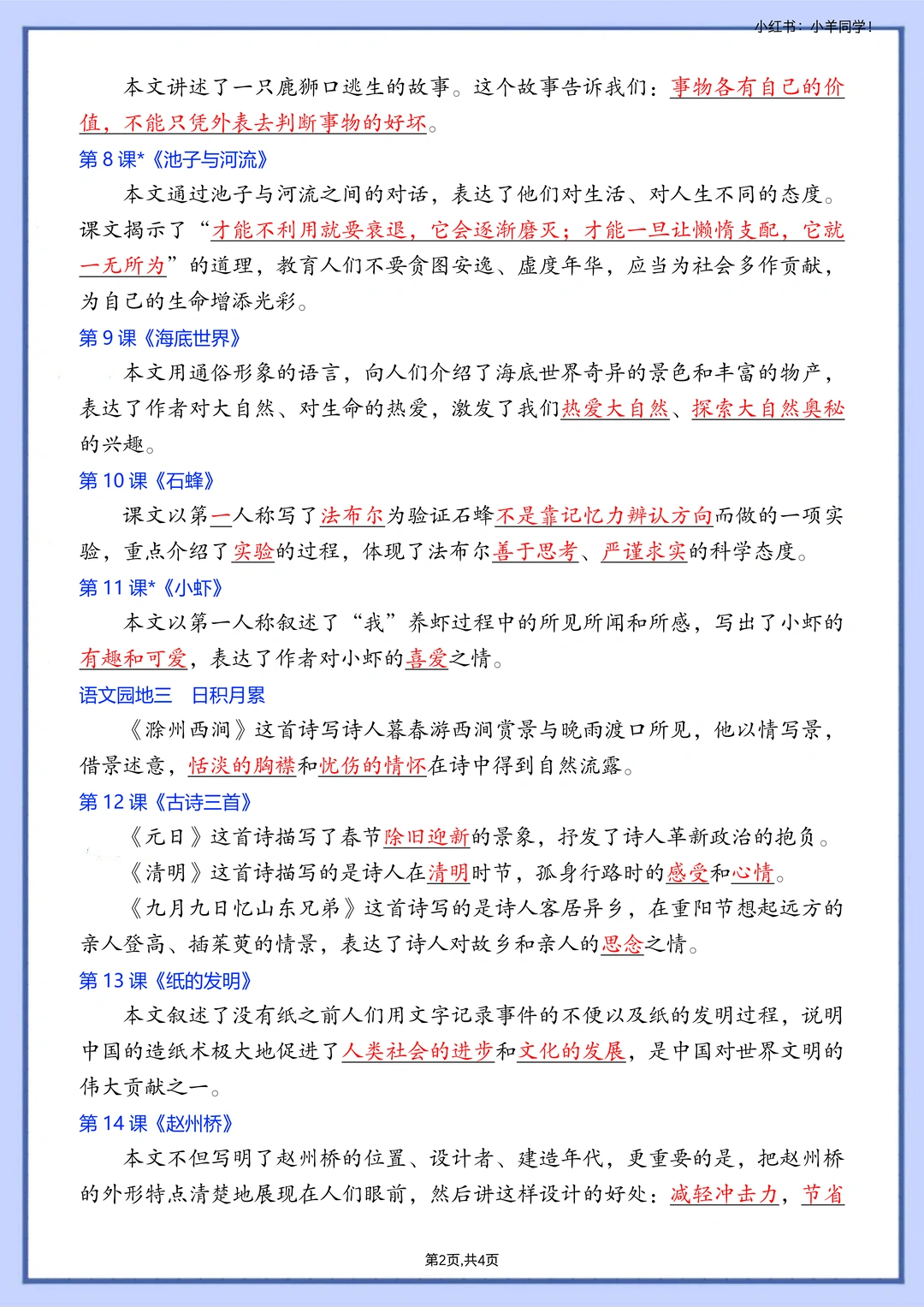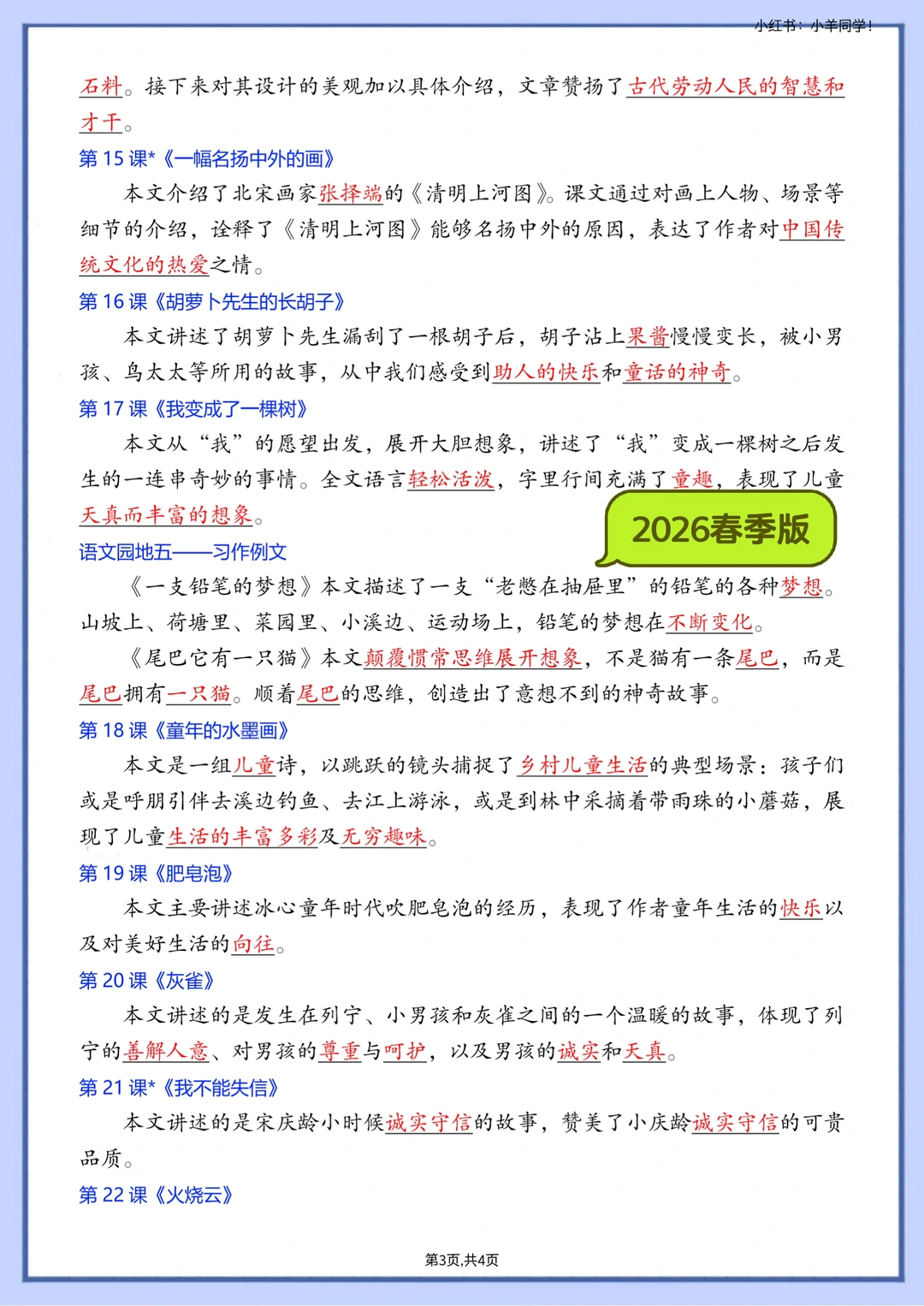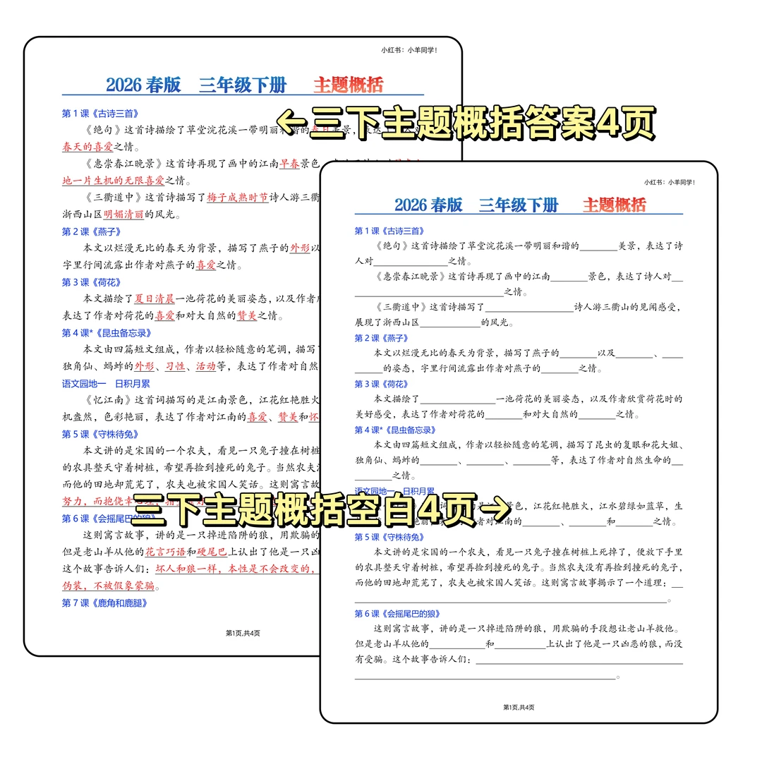[种草R] 2026春季版,改动还是挺多的 ✅新增课文《会摇尾巴的狼》《石蜂》《胡萝卜先生的长胡子》《灰雀》《暴风雨来临之前》 ❎删除课文《陶罐和铁罐》《花钟》《蜜蜂》《宇宙的另一百年》《剃头大师》《方帽子店》 [种草R] 🎈一共2个文件,下单后一起发送 🗂️主题概括答案版,4页。 🗂️主题概括空白版,4页。