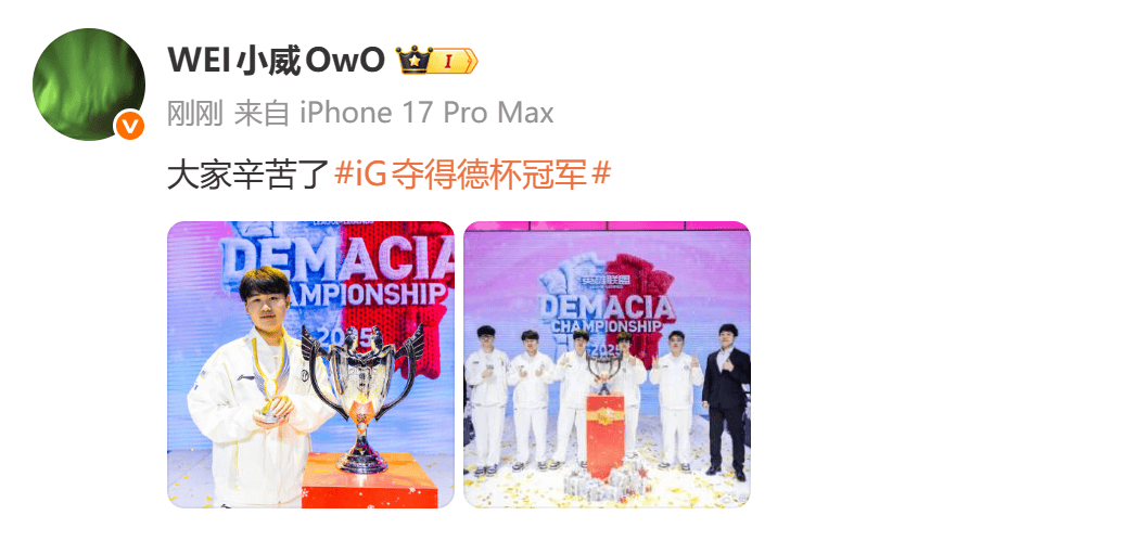 iG赢下2025德杯,获得决赛FMVP的Wei发文:大家辛苦了