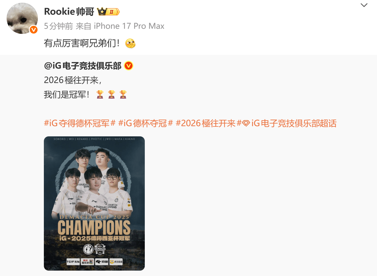 虎扑01月03日讯iG赢下2025德玛西亚杯,赛后Rookie发文祝贺iG夺冠: