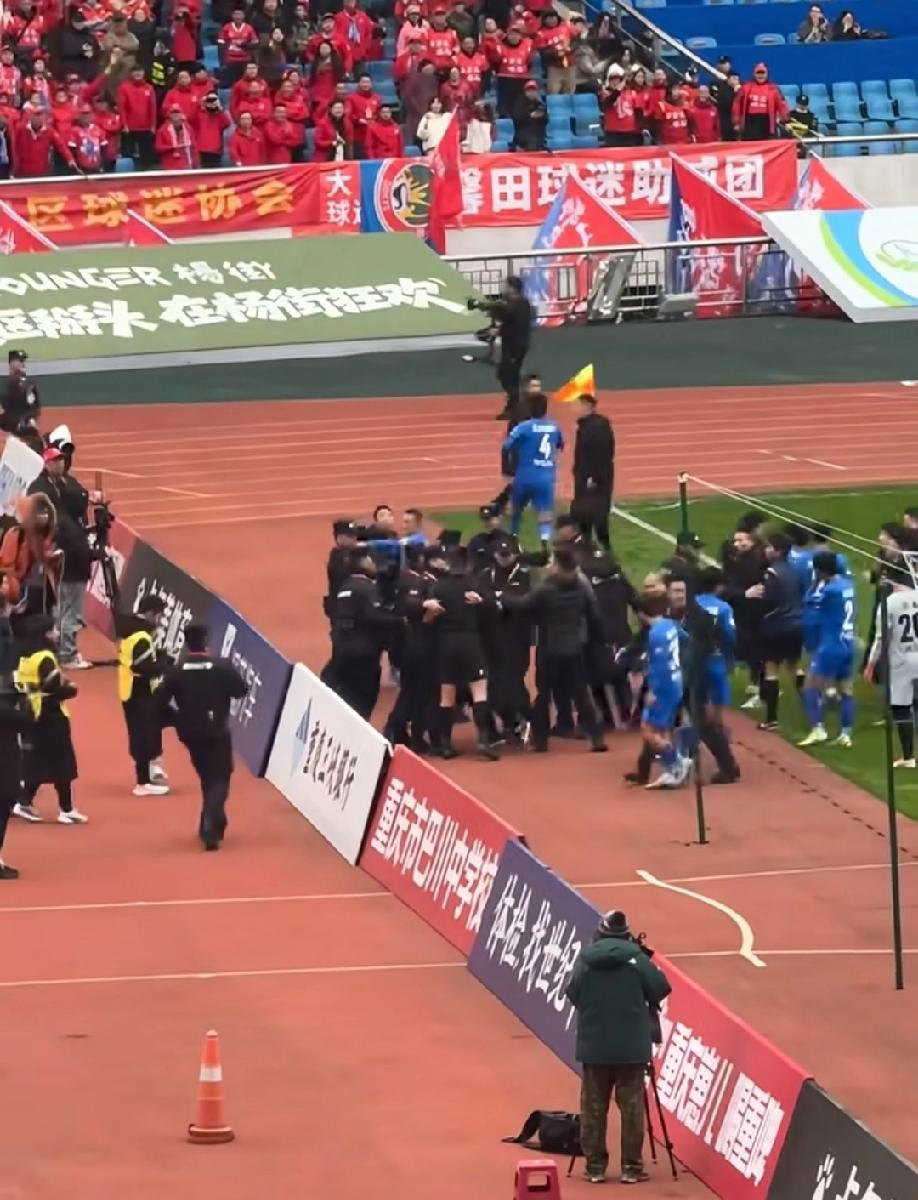 渝超上演诡异的一幕:球员追着边裁跑。这好像有点太过分了吧! 今晚渝超九龙坡vs大渡口的比赛中,疑是大渡口球员对裁判的判罚不甚满意吧,一开始是跟裁判拉拉扯扯,随后保安进场,这中间,其中一名大渡口球员像撵兔子一样追着一位边裁跑,边裁在前面跑,球员在后面追,这画面属实有点辣眼睛! 再回头说那个球,不管出没出界,边裁举旗主裁响哨就无效,这有什么好争的呢?还追着裁判打,真的是无法无天了!!!