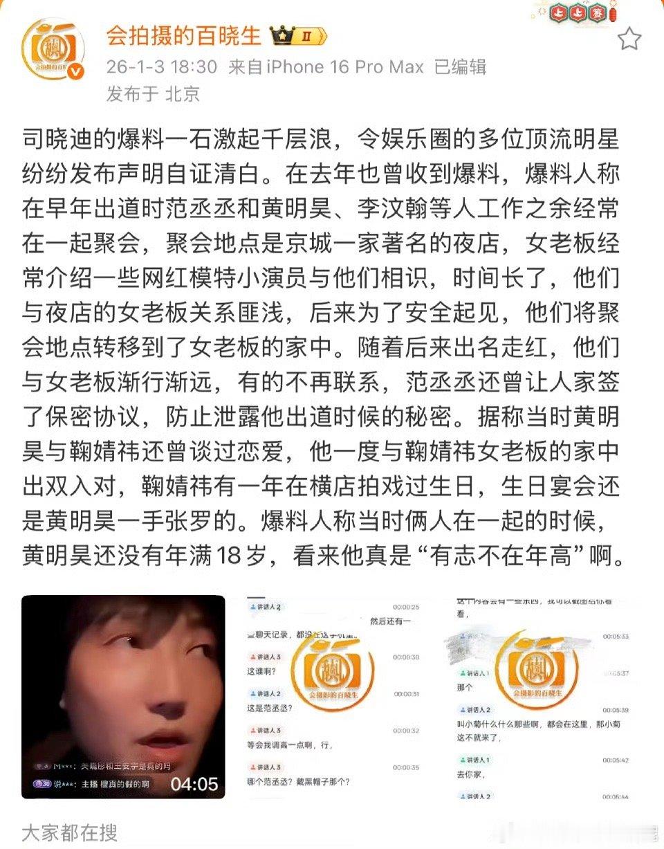 曝黄明昊鞠婧祎谈过 狗仔阳阳曝黄明昊鞠婧祎谈过:我说的这些我都有录音,当时黄明昊和鞠婧祎认识的时候他不够岁数,能懂吗?说白了就是未成年,就说白了,他两谈过。然后小鞠有一年在横店的生日是黄明昊一手张罗,亲手弄的。”