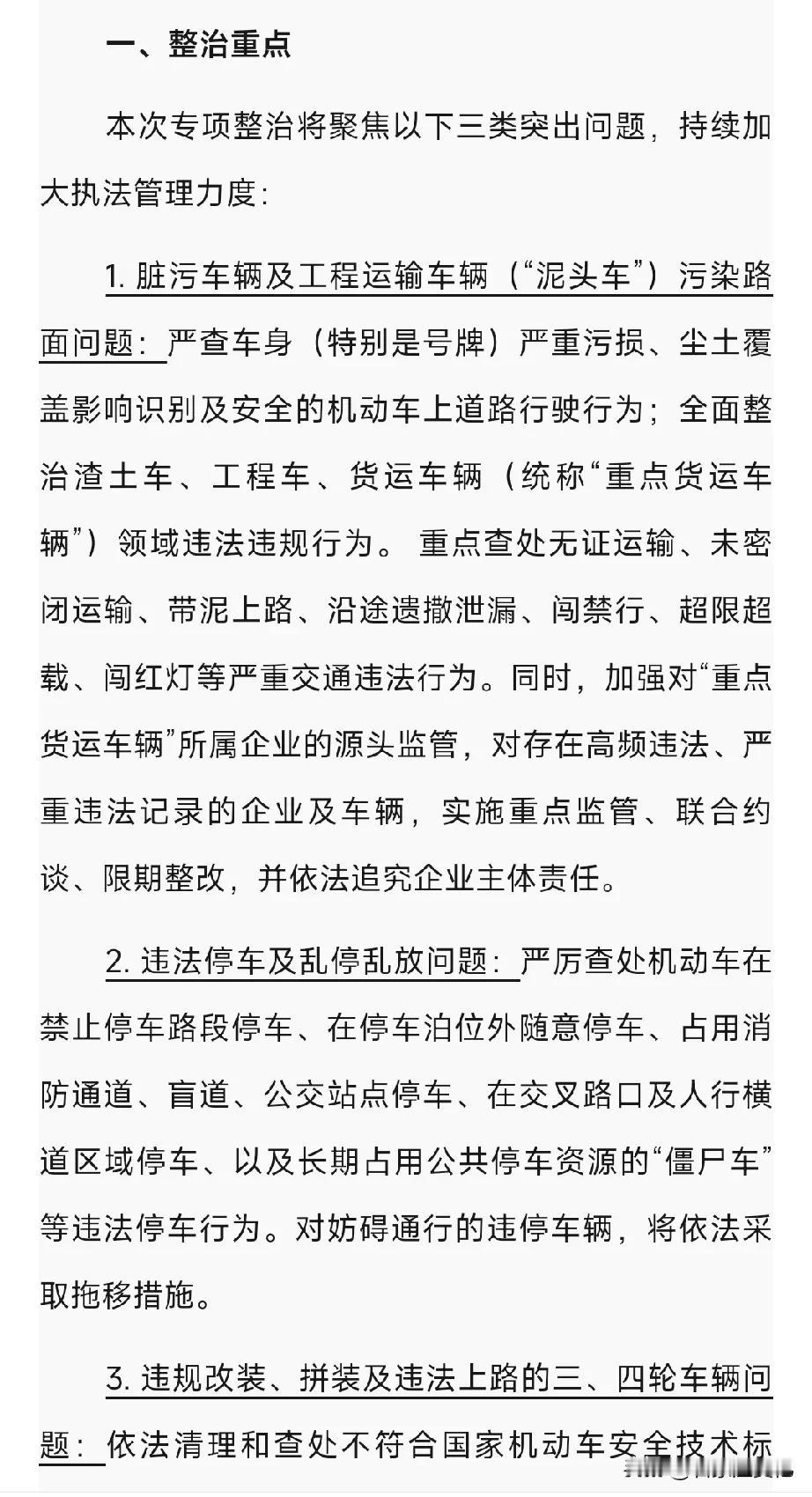 2026年全年的交通秩序专项整治从今天开始了,这次主要整治三大问题: 1、脏污车辆及工程运输车辆(“泥头车”)污染路面问题; 2、违法停车及乱停乱放问题; 3、违规改装、拼装及违法上路的三、四轮车辆问题。 这都是让老百姓非常头疼的问题,大车在路上疯跑,安全隐患很大 车辆乱停乱放问题确实很难管理,毕竟车很多,没地方放也是面临的真实问题,该如何改善有没有好的办法? 最后这个改装及三、四轮车辆其实也算好管理的,从源头出发,工厂禁止生产,一切都迎刃而解了嘛[偷笑] 治理的效果能怎么样?只能拭目以待了