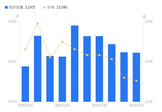 日期A股户数(户)流通A股户均持股数(股)户均持股市值(万元)2025-12-31313607842.379.442025-12-19314187827.899.522025-12-10326357535.989.732025-11-30338367268.499.502025-11-28338367268.499.502025-11-20354406939.529.232025-11-10307727992.2310.872025-10-31308517971.7610.352025-10-20338907256.9110.402025-10-10293018393.4611.16