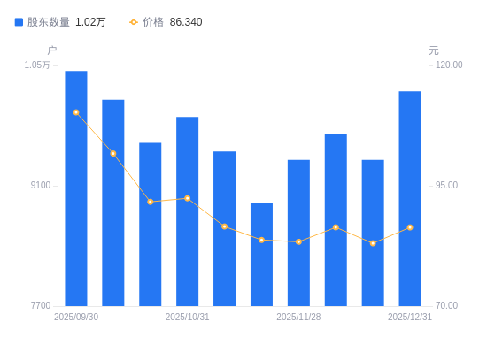 日期A股户数(户)流通A股户均持股数(股)户均持股市值(万元)2025-12-31102004843.2541.822025-12-1994005255.4543.642025-12-1097005092.9143.982025-11-2894005255.4543.802025-11-2089005550.7046.482025-11-1095005200.1345.002025-10-3199004990.0246.102025-10-2096005145.9647.162025-10-10101004891.2149.742025-09-30104364733.7352.19