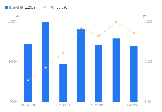 日期A股户数(户)流通A股户均持股数(股)户均持股市值(万元)2025-12-31119814465.2915.882025-11-28129324136.9216.452025-10-31121174411.5915.102025-09-30140453806.0014.332025-09-1996785523.3815.292025-06-30149293580.637.742025-03-31121894385.537.242024-12-31102475216.678.302024-09-30119214484.127.722024-06-30130332684.884.61