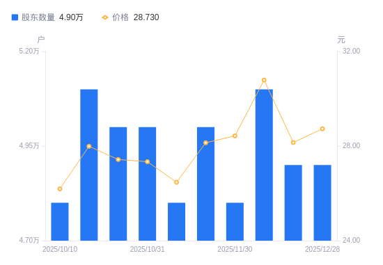 近一年(2024年12月31日至2025年12月28日),中颖电子A股股东户数从5.43万户,减低至4.9万户,降幅9.78%,区间股价上涨11.74%。