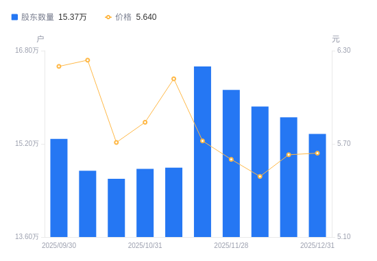 近一年(2024年12月31日至2025年12月31日),吉电股份A股股东户数从17.02万户,减低至15.37万户,降幅9.71%,区间股价上涨5.76%。