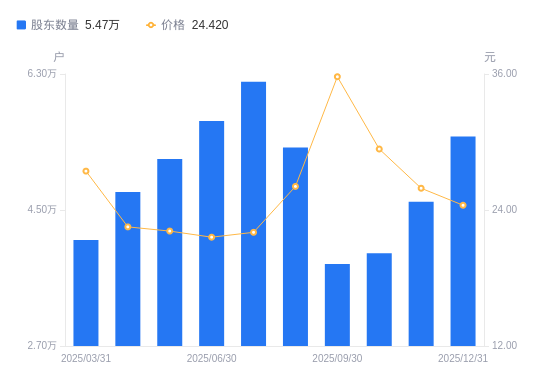 日期A股户数(户)流通A股户均持股数(股)户均持股市值(万元)2025-12-315472118671.0845.592025-11-304609822163.6557.452025-10-313927426014.6776.432025-09-303785926986.9896.512025-08-315326519181.4550.032025-07-316198416483.2936.312025-06-305679317989.8938.862025-05-315173519748.7243.722025-04-304739721556.2248.522025-03-314101924907.9768.32