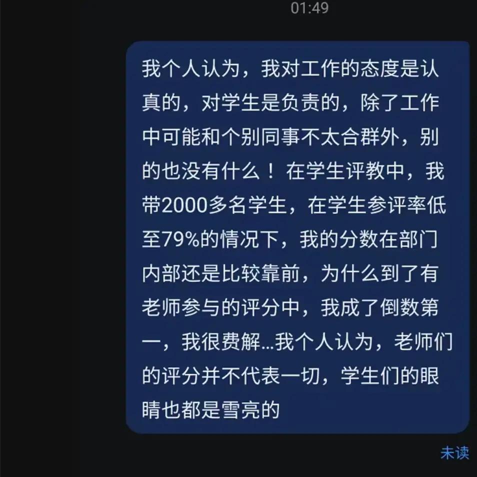 学生评教分数靠前,老师评分成倒数第一?山东一高校教师称考核不公,回应:将扎实调查。 在这个快节奏、充满变数的教育环境中,一条看似普通的学生评教与老师评分的事件,却牵扯出一系列深层次的教育公平与职业尊严的话题。或许很多人会觉得,这只是个个别现象,但当我们静下心来审视,背后折射出的,却是制度的漏洞、评价的偏差,以及教师群体在当今社会中的尴尬位置。 这位山东教师的经历,让人不禁想问:评分的背后,究竟隐藏着怎样的公平与公正?学生的评价,是否真能反映教师的教学水平?而老师的专业能力,是否也被一纸评分所左右?更何况,她在学生评教环节表现优异,却在老师评分中跌至倒数第一,这样的巨大反差,难道仅仅是因为评分标准的“漏网之鱼”吗? 我们不得不关注的是,学校官方的回应:成立工作专班,进行调查,评审有专门的表格,分为四大板块。听起来似乎很严谨,但背后真正的问题,或许远比表面复杂。评分机制是否科学合理?是否存在人为偏差?教师的辛勤付出,是否被一纸数字轻描淡写或误导?尤其是在“带节奏”的评论区,有网友提到“类似情况也发生过”,这无疑让人对“公正”二字充满怀疑。 更令人担忧的是,教师们的职业尊严正受到挑战。有人选择离开,是否仅仅是个人原因?还是制度的缺陷让他们无法忍受?当“倒数第一”成为标签时,是不是意味着某种不公平的打击?而这种不公,最终会折射到学生身上——他们能否真正获得公平的教学环境?老师是否还能心无旁骛地专注于教学,而不是被评分绑架? 我们需要深思:在这个以“成绩”和“排名”衡量一切的时代,教师的价值是否被扭曲?教育的本质是否被忽略?如果一个教师的努力只能用数字来衡量,那我们是否也在无形中剥夺了教育的温度和人性? 这起事件,绝不仅仅是个别的“评分问题”,它是一面镜子,映照出我们对教育公平的期待与现实之间的巨大差距。作为社会的一员,我们应当呼吁:制度要更加透明、公正,评价要科学合理,不能让“数字”变成“偏见”的代名词。只有如此,才能真正呵护每一位教师的职业尊严,也为我们的下一代营造一个更公平、更温暖的学习环境。