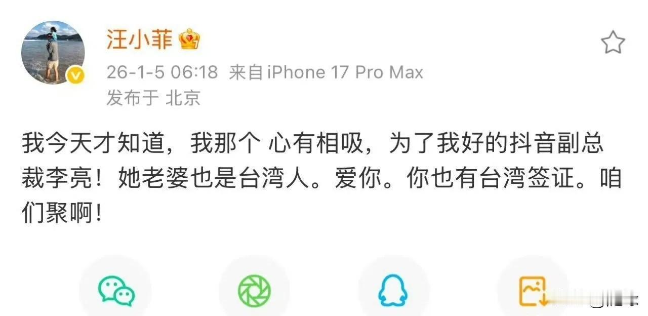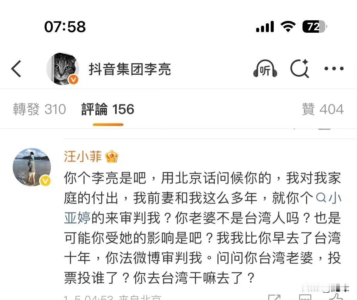 汪小菲又情绪崩溃了!真是让人哭笑不得! 今天凌晨发文后又删除,不过还是被网友截图了。 “风号”过去已经快一年了,他又一次隔空喊话抖音副总李亮,看来,他对这件事情一直耿耿于怀,觉得自己受委屈了。 他还说前面两个孩子,因为台湾法律问题一直不能回北京,还叙述了一遍自己从小到大的经历。 通篇看上去有点胡言乱语,貌似喝多了。看来,没有马筱梅在身边,他又开始情绪不稳定了! 终于能理解的大S了,跟一个情绪化的男人生活在一起有多累!他就像是一个没长大的孩子,情绪随时有可能爆发,让人防不胜防!