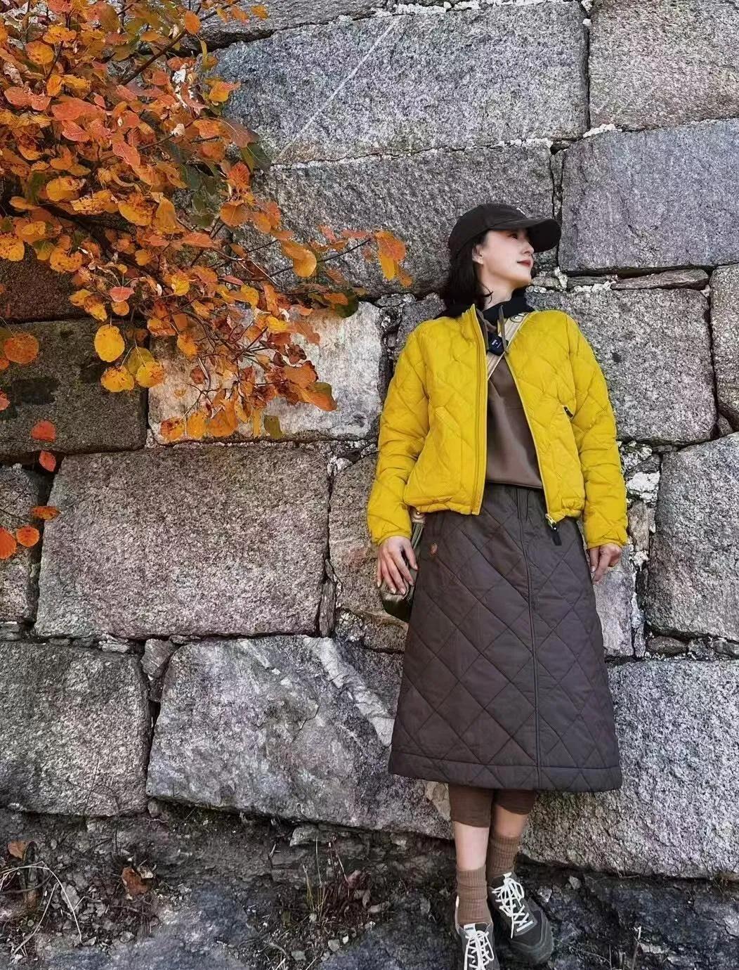 被45岁张蕾的秋日穿搭狠狠种草了! 短款亮色棉服提升腰线,搭配同材质的深色半裙,