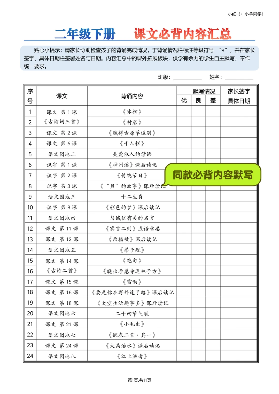 别小看这短短假期,二年级下册语文必背内容可是重中之重,必须牢牢掌握!