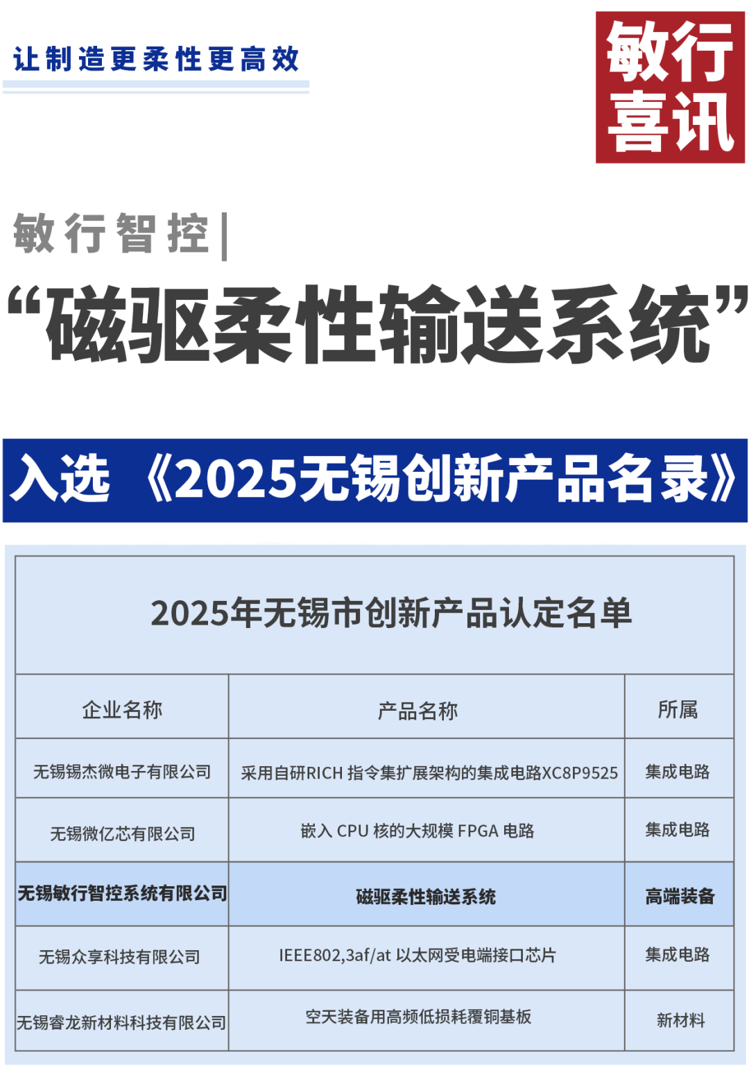 近日,无锡市工业和信息化局正式发布《2025 年无锡市创新产品推广应用目录》,敏行智控自主研发的 “磁驱柔性输送系统”凭借领先的技术优势与显著的应用价值成功入选,标志着公司在高端装备领域的创新能力获得市级权威认可,也为行业智能化升级注入新动能。