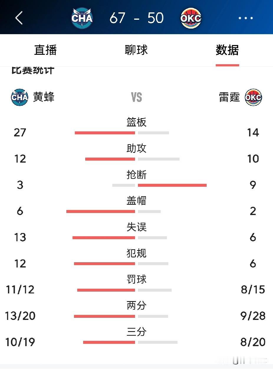 半场落后17分!雷霆队官方都不敢相信! 今天雷霆队主场背靠背对阵黄蜂队的比赛,半场战罢,他们以50-67落后多达17分,这是雷霆队本赛季最大的半场落后分差,竟然是拜黄蜂队所赐。转折点发生在第二节比赛,雷霆队单节26投仅4中,罚球13罚仅6中,全队手感冰凉,单节净负17分。 雷霆队这样的表现不仅出乎所以球迷的意料,连他们自己的官方都难以置信。半场结束后,雷霆队官方晒出推文,图片上的比分是雷霆67-50黄蜂,将两队比分反了过来,闹了大笑话。这说明雷霆队官方人员也不敢相信主队竟然会半场输给黄蜂队17分,所以才把比分对换了吧。