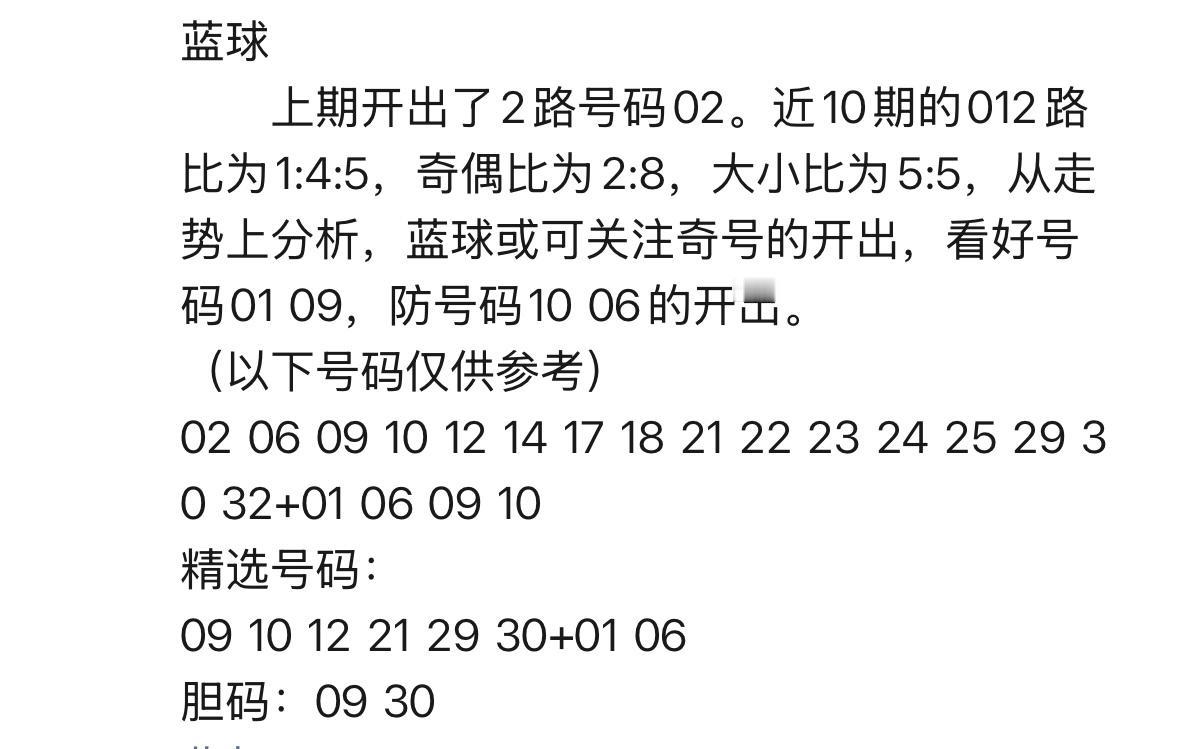双色球第26003期开奖在即,丹丹如约而至。本期亮点纷呈,精彩看点如下: 一、连号组合两重奏:09与10携手,29与10并肩。 二、上期重号温情延续:红球30再度亮相。 三、同尾号码成双对:09配29,10伴30。 四、红球胆码重点聚焦:09与30值得期待。 五、蓝球四码精析:01、06、09、10静候佳音。 六、蓝球双星点睛:01与06尤为瞩目。 纵观本期,蓝球01与06皆为热号,备受青睐。愿此番开奖能得幸运眷顾,不负众望,共迎惊喜。