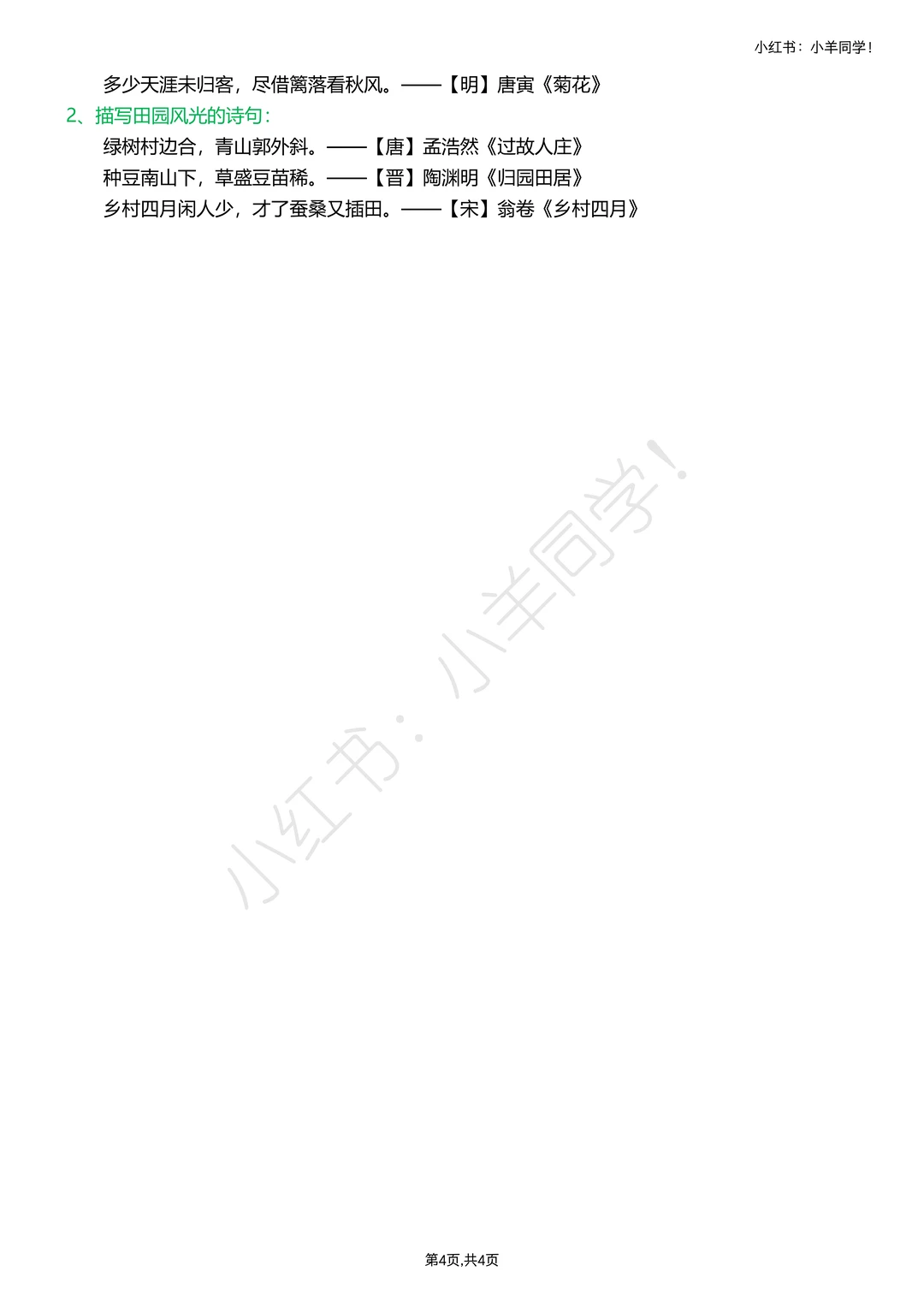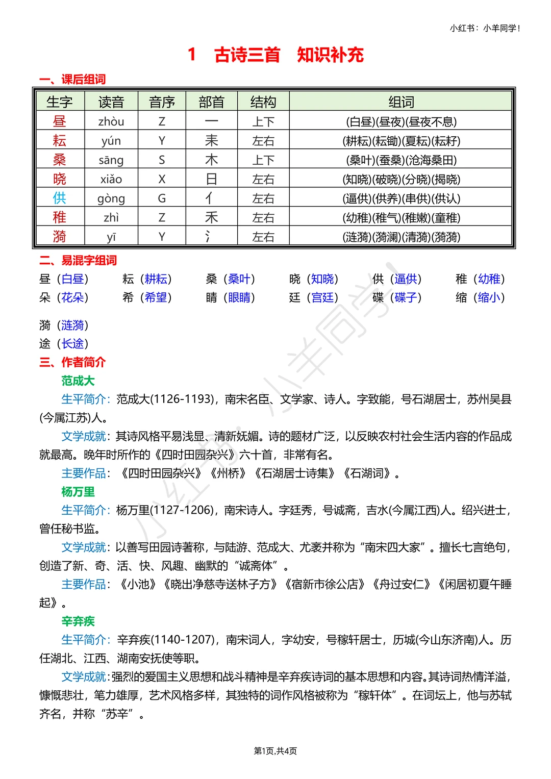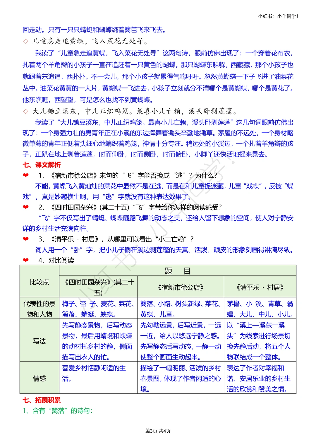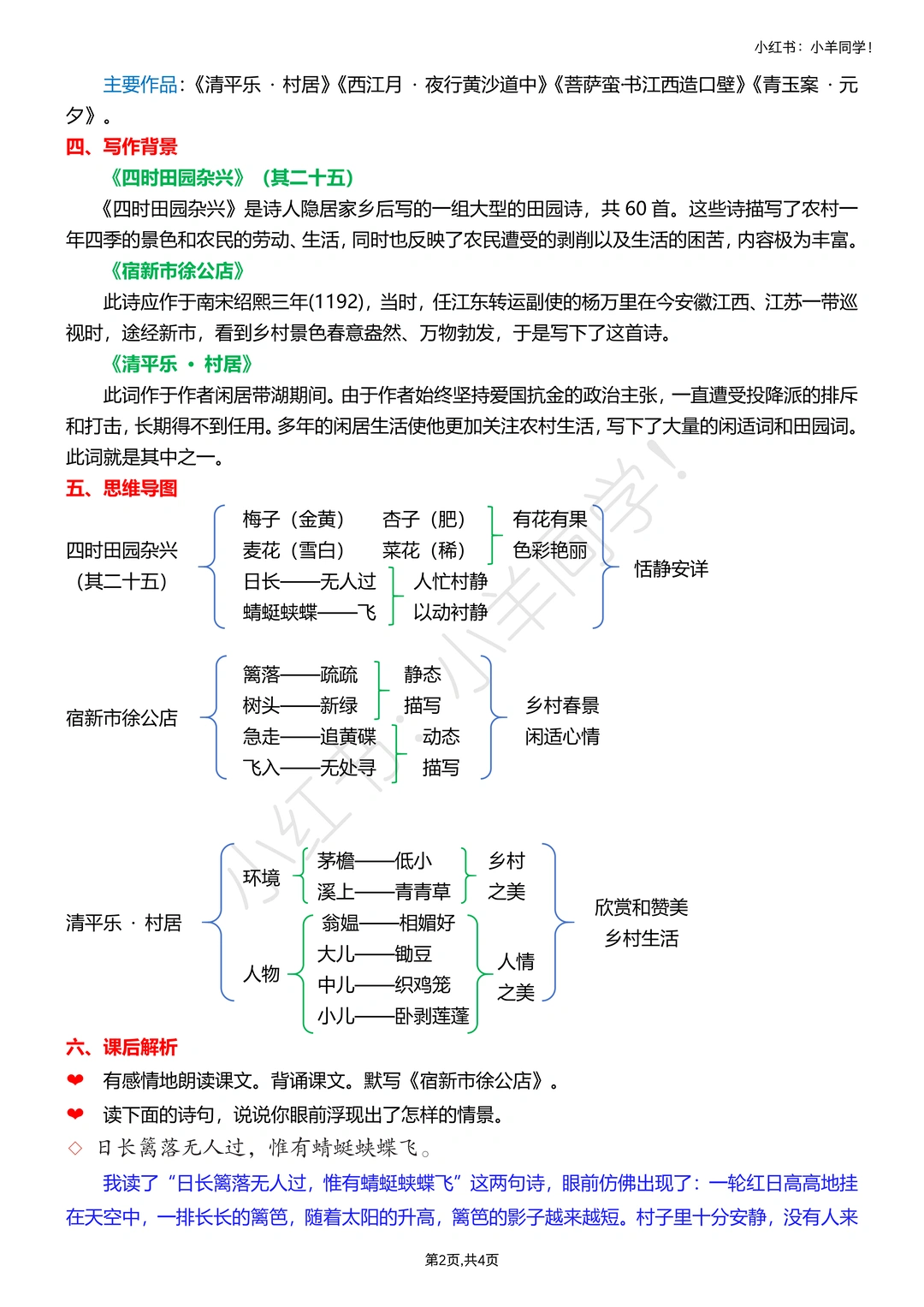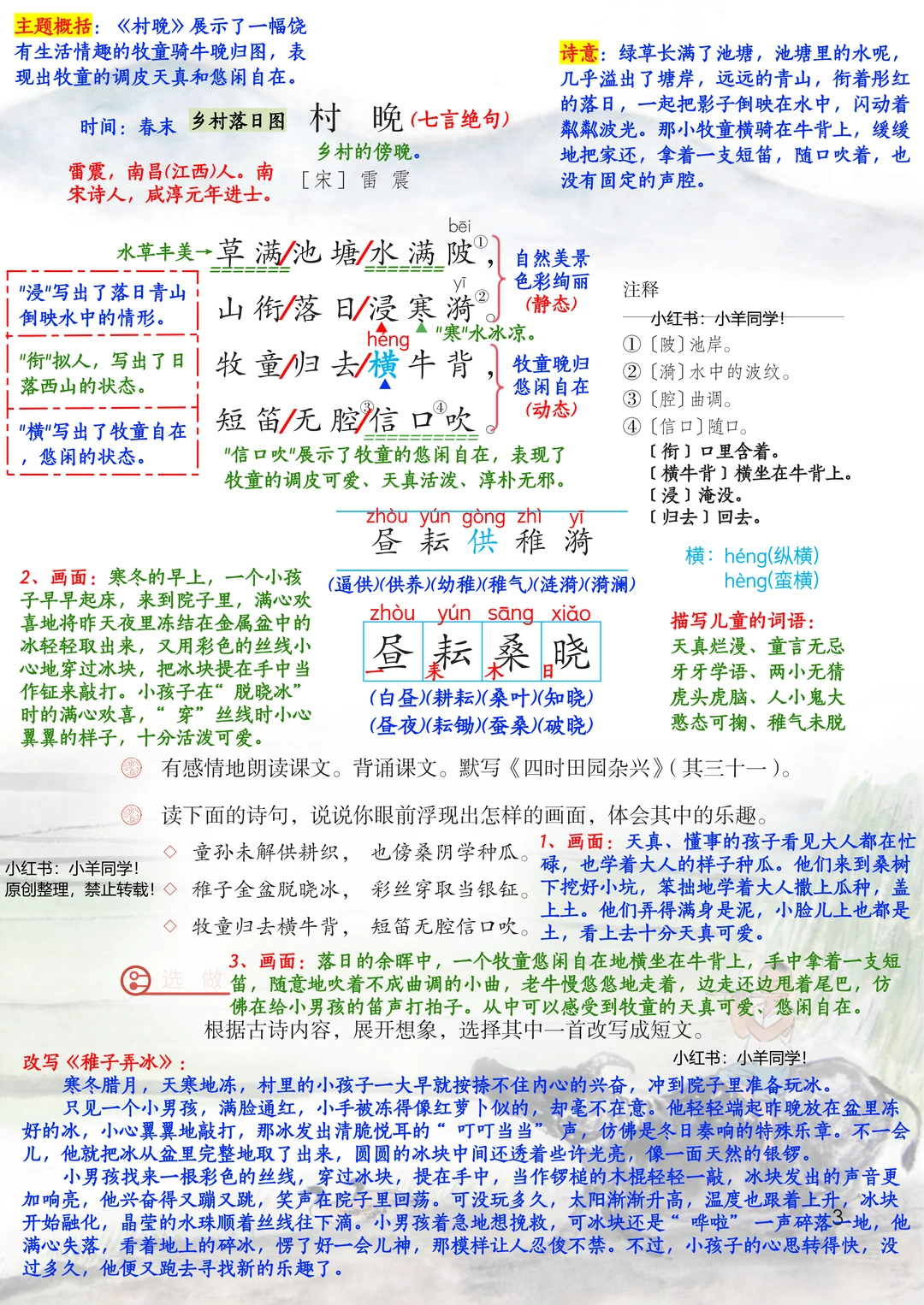 分清三首诗节奏:《四时田园杂兴》(其三十一)轻快、《稚子弄冰》灵动、《村晚》闲适;必背默《四时田园杂兴》(其三十一),理解后背诵更高效。