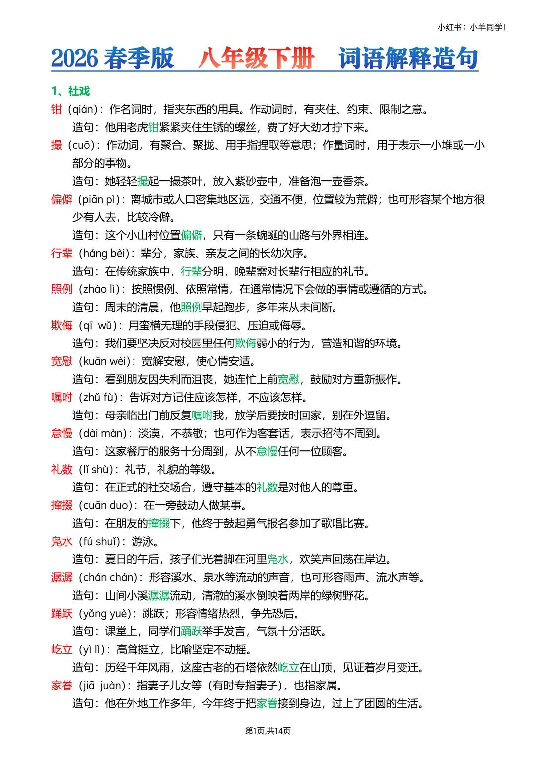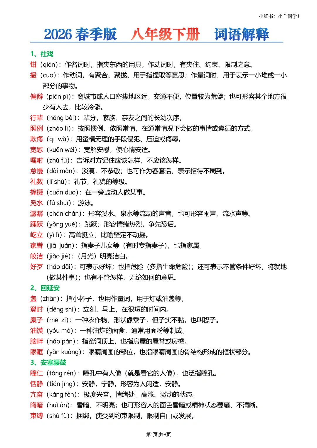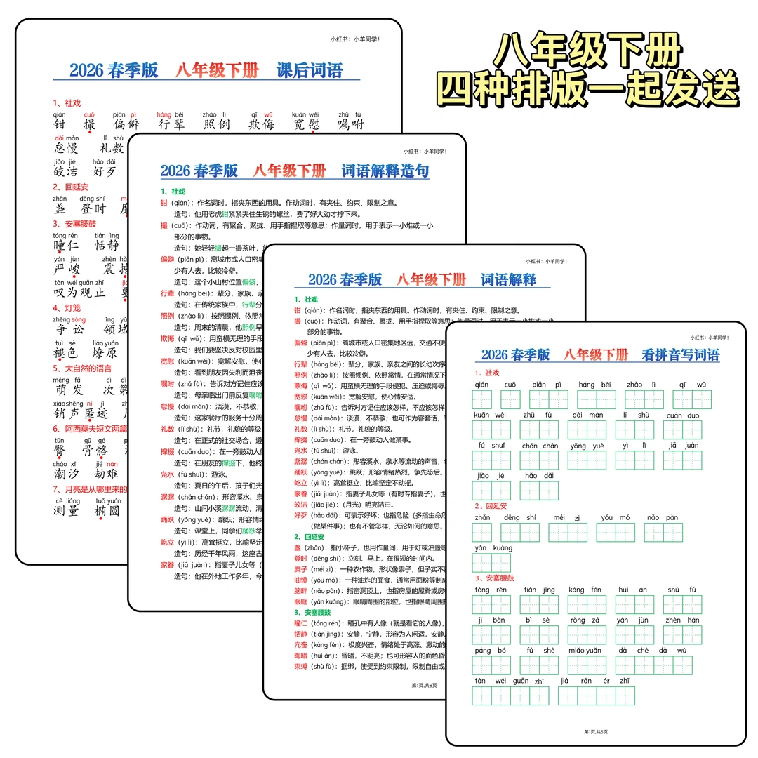 是改版后的新课标哦~ 一共四个文件: 🗂️词语表,3页。 🗂️看拼音写词语,5页。 🗂️词语解释,8页。 🗂️词语解释+造句,14页。 ⚠️原创整理,禁止转载发布网络平台或商用。
