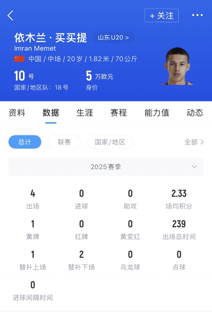 遗憾的是依木兰长期受到伤病影响,2025赛季中超联赛仅出场1次。在对阵三镇的比赛中,依木兰在4-0领先的情况下,第71分钟替补登场,这也是他在中超的处子秀。