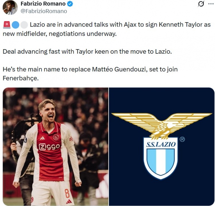直播吧1月7日讯据知名转会记者罗马诺报道,拉齐奥与阿贾克斯就中场肯尼思·泰勒交易进行深入谈判。