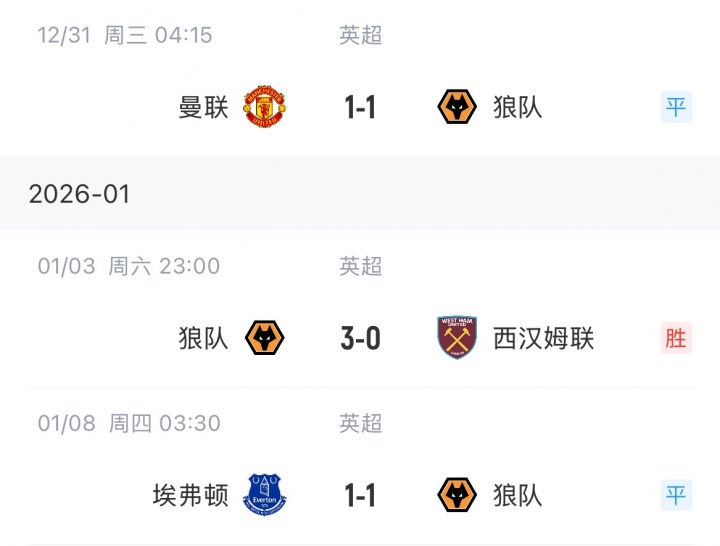 第19轮客场在老特拉福德抢到1分后,狼队似乎开启了复苏模式,第20轮他们3-0横扫同样深陷降级区的西汉姆联,本轮他们客场又战平了排名高出数位的埃弗顿。