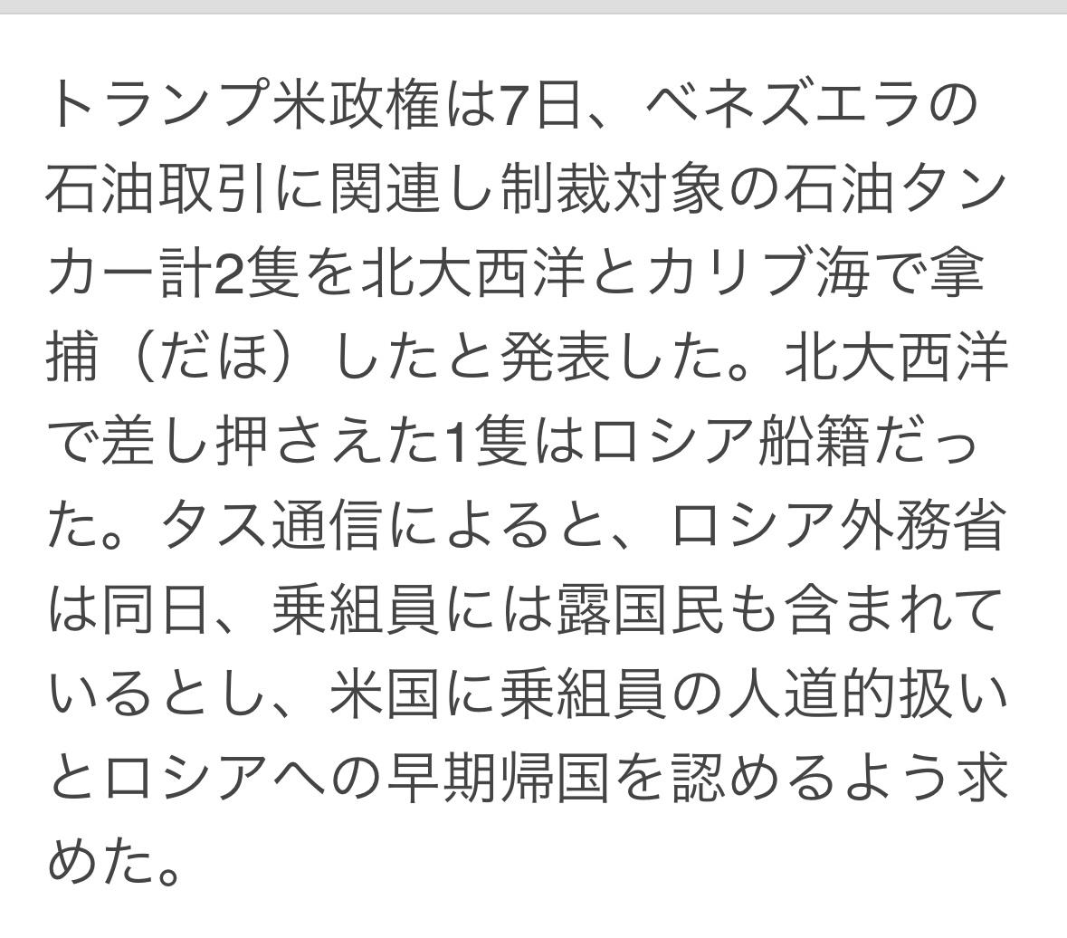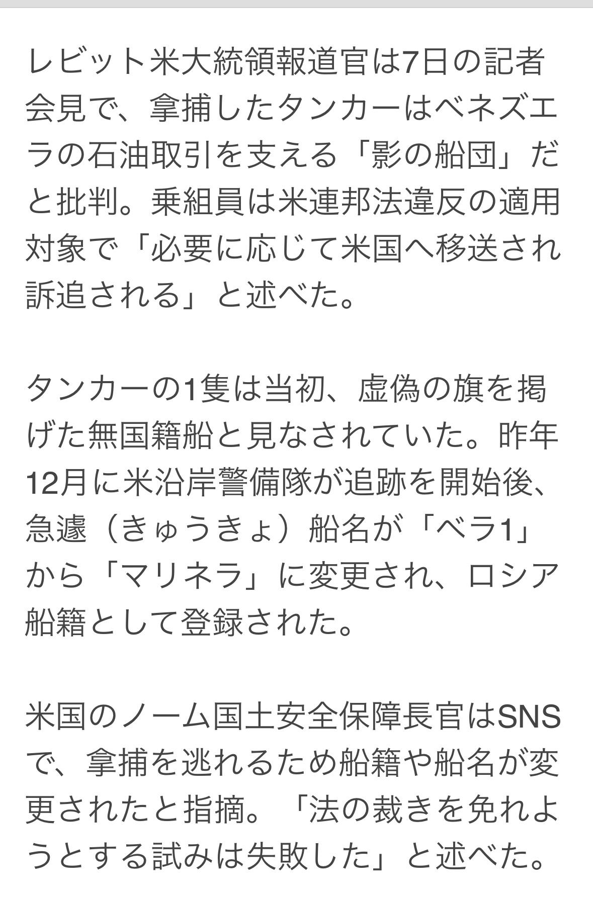 7日,美国在北大西洋和加勒比海扣押了两艘因与委内瑞拉石油贸易有关的、受到制裁的油轮。其中一艘悬挂俄罗斯国旗。 俄罗斯指责美国是违反国际法的“海盗"。美国批评被扣押的油轮是支持委内瑞拉石油贸易的“影子舰队”,如有必要,将引渡到美国审判。 另一艘油轮最初被认为是悬挂假国旗的无国籍船只。去年12月,美国海岸警卫队开始追捕该船后,船名被匆忙从“Bella 1”改为“Marinella”,并注册为俄罗斯船只。