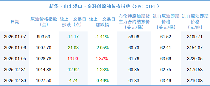 新华财经北京1月8日电(郑大伟)截至2026年1月7日,新华·山东港口·金联创原油价格指数(SPGCIPI)报993.53点,较前一交易日下跌14.17点,跌幅1.41%;进口原油即期价格为61.52美元/桶,合人民币3109.71元/吨。山东港口进口原油综合到岸贴水估价为-1.17美元/桶,较前一交易日下跌0.03美元/桶。