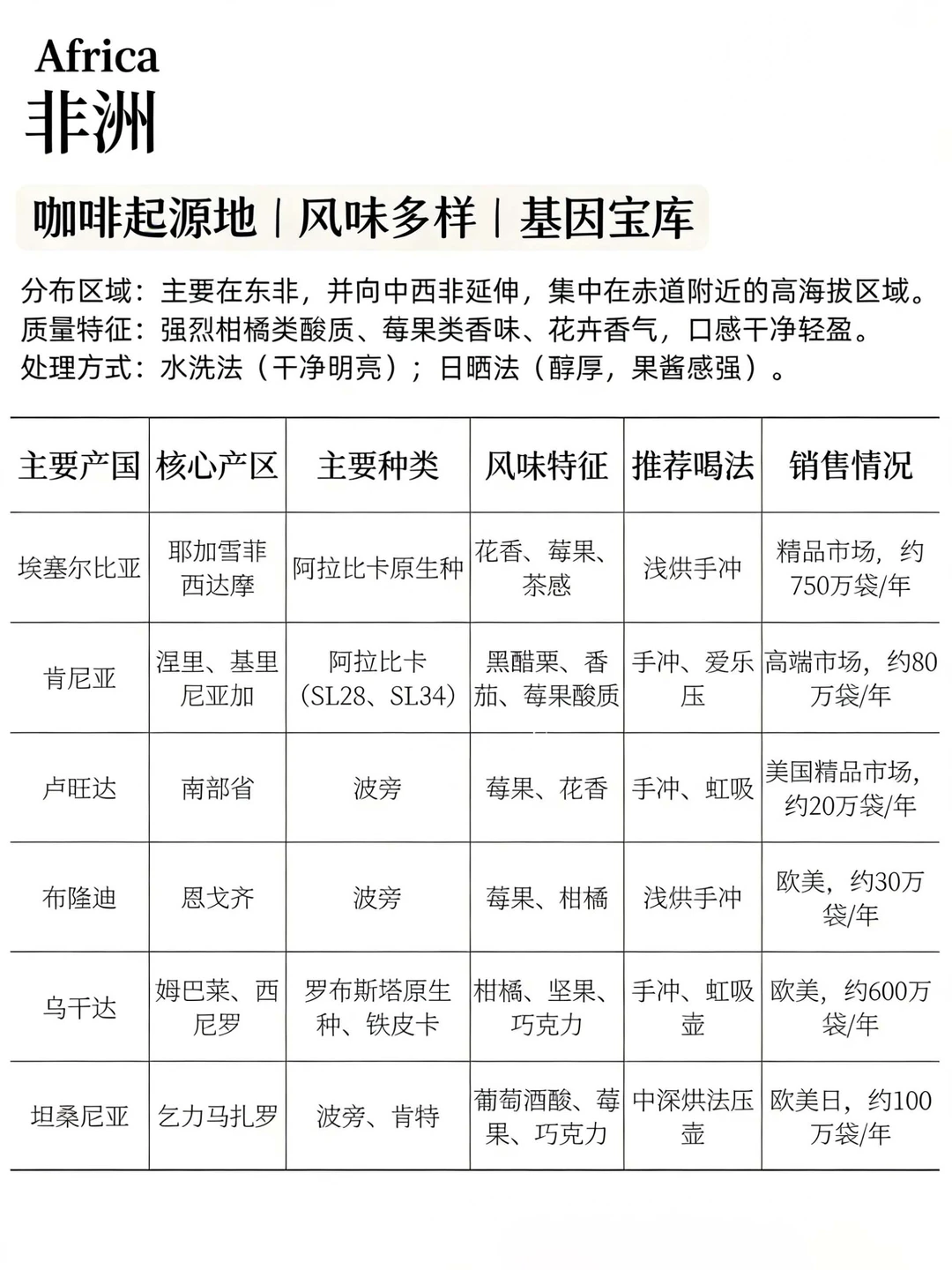 - 产区分布:主要集中于东非赤道附近的高海拔区域,部分向中西非延伸。