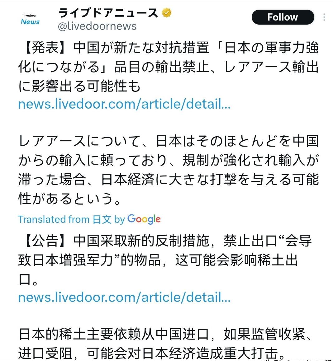 [太阳]没想到日本反应情绪如此之大!在我们严格管控军民两用物资对日本进行反制之后,日本国内情绪非常激动。有日本网友就说,这样的管制措施比当年欧洲对付中国的瓦森纳协议管制还要严格。中国对日本禁运的军民两用商品,目录就列了一百多页。 这份长达138页的管制目录,是中国商务部通过官方公告对外发布的,涵盖核、生化、导弹、常规武器、先进电子、战略材料等八大类物资,明确全面禁止所有军民两用物项对日本军事用户及军事用途出口,民用贸易则保持正常。 日本国内的情绪波动从网络舆论蔓延到主流媒体,多家日本主流媒体连续跟进报道这一管制措施,报道中不难看出明显的焦虑情绪,反复梳理可能受影响的关键物资供应链。 不少日本网友在社交平台讨论时,除了拿瓦森纳协议对比,还担忧国内相关产业会受到严重冲击。 要知道,瓦森纳协议是西方主导的技术封锁机制,日本曾是积极参与方,如今面对中方的正当反制,却有官员出面指责中方措施与国际惯例不符,这种说法显然站不住脚。 中方出台这一管制措施,并非临时起意,此前,日本自民党代理干事长萩生田光一曾窜访中国台湾地区,还与“台独”势力进行接触,之后更宣布近30名国会议员计划在2026年初集体“访台”,这种行为明显触碰了中国的核心利益红线。 日本首相高市早苗也多次在公开场合发表涉及台海问题的不当言论,暗示可能武力介入台海局势,甚至对《中日联合声明》确立的战后秩序提出质疑,这些言论不仅干涉了中国内政,也违背了《开罗宣言》《波茨坦公告》中对日本作为二战战败国的相关约束。 在此之前,日本三波经济代表团曾提出访华请求,均被中方婉拒,日方试图推行的“政治经济分开”策略并未得到中方认可。 从产业依赖情况来看,日本相关产业对中国供应链的依赖程度不低,根据公开的贸易数据,2024年日本稀土进口中来自中国的占比达到71.9%,总体依赖度约60%,其中导弹制导、雷达永磁电机所需的重稀土,依赖度更是高达80%。 除了稀土,镓、锗等用于军用夜视仪、卫星组件的关键材质,日本在加工环节也高度依赖中国供应,日本国内的多家核心军工企业,正在推进多项军工项目,这些项目的核心零部件生产都离不开中国供应的相关材料。 有业内分析指出,以日本现有战略储备来看,相关物资最多只能维持3到6个月,之后部分生产线可能面临停滞风险,日本国防工业生产效率也可能因此受到影响。 在经济层面,这种影响已经开始显现,日本不少电子制造企业因为核心材料供应不确定性,开始调整生产计划,部分企业已经出现成本上升的情况。 日本防卫省内部文件显示,受此次管制影响,2026年度国防预算可能需要额外增加2000亿日元,用于紧急采购替代物资,但全球范围内能够批量生产军用级重稀土磁体的企业数量有限,短期内找到合格的替代供应商难度不小。 中方在相关公告中已经明确,此次管制措施是为了维护国家安全和利益,履行防扩散等国际义务,回顾历史,2010年中日因钓鱼岛问题产生摩擦时,中方曾对日本实施过局部稀土出口管制,当时就对日本相关电子企业生产造成了影响。 与那次相比,此次管制范围更广、覆盖品类更全,从上游原材料到下游精密组件形成了全链条管控,当前中国在重稀土提纯、镓锗单晶制备等关键环节,全球市场份额仍超过85%,技术壁垒较高,这也使得日本寻找替代供应渠道的难度进一步加大。 这场风波的本质,是日本右翼势力无视历史经纬、触碰中国核心利益引发的必然结果,中方的反制措施有理有据有节,既是对日本不当行为的回应,也是在维护战后国际秩序和地区和平稳定。 对于日本而言,当前更需要做的是正视自身行为带来的后果,恪守一个中国原则,尊重中国核心利益,通过对话协商解决分歧,而不是继续推行挑衅性政策,只有这样,才能为中日关系的改善创造有利条件,避免相关产业和民生受到更大影响。
