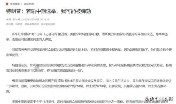 特朗普转性了?还是得高人指点了?据新华社媒体1月6日报道:特朗普当天在华盛顿举行的众议院共和党籍议员会议上说:“你们必须赢得中期选举,因为如果我们输了,他们就会找个理由弹劾我。”有人可能觉得纳闷,以前这特朗普天不怕地不怕,说话办事横得很,怎么突然变得这么“实在”,还主动催着议员保席位? 熟悉特朗普的人都知道,他之前可不是这副模样,就像新华社报道的那样,他第二任期一上来就靠着大量行政令推进政策,动辄就宣布紧急状态,不管是处理边境问题还是贸易事务,都透着一股说一不二的强硬劲儿,完全不把制衡放在眼里。 甚至他还曾公开表示自己作为总统有权做任何想做的事,那股天不怕地不怕的劲儿让人印象深刻。 可这次在众议院共和党籍议员会议上的发言,却透着不一样的谨慎,这场会议是在刚改名的“特朗普-肯尼迪表演艺术中心”举行的。 特朗普除了催议员赢中期选举,还在讲话中间接提到了五年前的国会山骚乱,吐槽媒体没如实报道他当时呼吁“和平、爱国”前往国会的言论。 这些细节都能看出,他这次发言不是随口一说,而是带着明确的担忧。 其实这背后的原因并不复杂,也不是什么转性或得高人指点,近期共和党在众议院的优势本来就不稳固,先是有重要盟友辞去国会众议员席位,接着又有共和党籍议员突然去世,让席位优势进一步缩小。 而特朗普自己有过两次被弹劾的经历,深知失去国会多数席位意味着什么,他很清楚,一旦共和党在中期选举中失利,民主党大概率会找机会对他发起弹劾。 所以他这次主动催着议员保席位,说白了就是为了保住自己的执政根基。 以前的强硬是因为有足够的政治支撑,能靠行政令推进政策,而现在面对席位缩水和弹劾风险,只能放下之前的架子,直白地跟议员们摊牌。 这种转变不是性格变了,而是现实处境让他不得不变得“实在”,毕竟保住国会多数席位,才是避免被弹劾的关键。 以上都是个人观点,对此您有什么不同的看法,可以在评论区留言讨论!!!