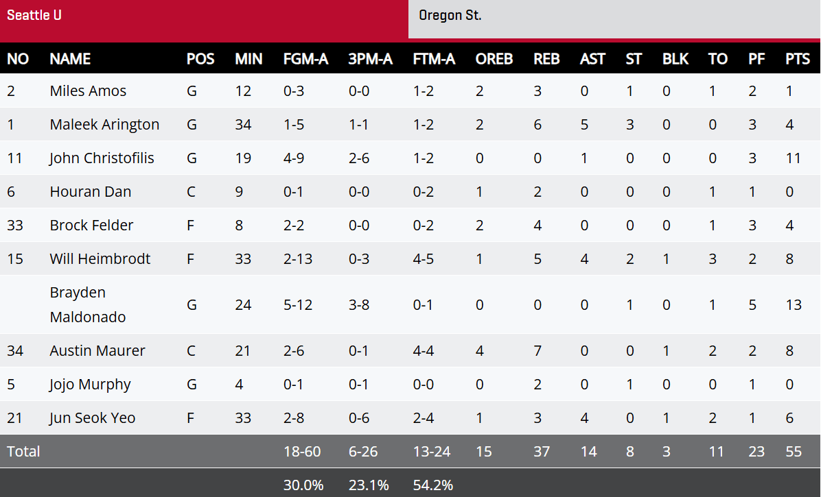 虎扑01月09日讯今日NCAA常规赛,西雅图大学55-68不敌俄勒冈州立大学。