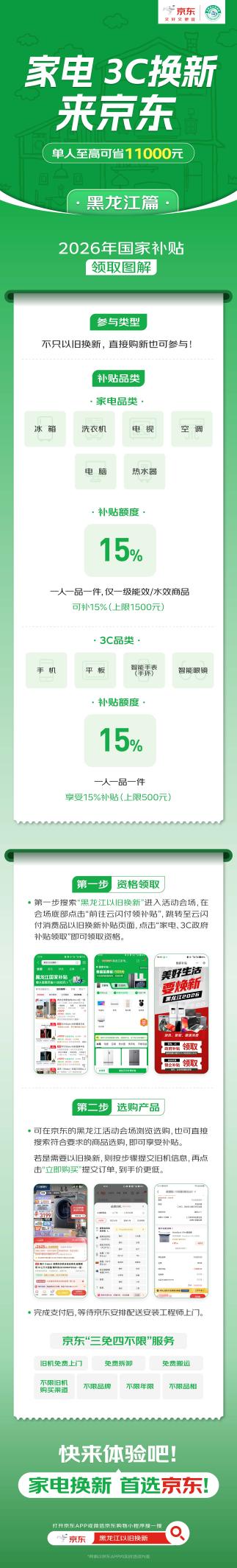 近日,2026年国家以旧换新补贴落地黑龙江,京东线上线下全面承接国家补贴落地。黑龙江消费者到京东APP搜索“黑龙江以旧换新”即可进入国补页面,享国补购心仪好物。上京东,消费者购买活动指定的冰箱、洗衣机、电视、空调、电脑、热水器产品,单件/单次至高补贴1500元;购买活动指定的手机、平板、智能手表手环、智能眼镜产品,单件/单次至高补贴500元。单人累计至高可省11000元!此外,京东也带来海量爆款好物,1月1日起,上京东领国补,买手机、电脑、家电等好物低至五折!
