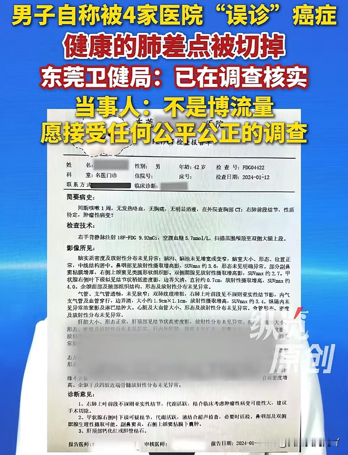 因为咳嗽被四家医院诊断为肺癌,结果却是误诊‼️ 聪明的老百姓已经自学了只要重病哪怕麻烦也多看几家医院的自保方法遇到这种情况也无解了 近日男子曝光被4家医院诊断患癌并告知需尽快手术最后查出并未患癌的惊天反转,男子表示对自己所说一切负法律责任,只求一个公平公正的调查结果 2024年1月男子因为咳嗽严重去东莞一家医院看病,ct检查后医生告诉他肺部有一个19毫米结节,并且是恶性的须马上手术。男子考虑到这家医院规模不算大如果手术还是想要去一家大一点的医院,于是男子又辗转去了东莞一家三甲医院,花300多挂了个专家号,专家建议做pet ct比普通ct检查更全面,但是费用比较贵要1万多而且不能报销需全自费。男子做了pet ct后医生得出结论肺部有一个19毫米结节,恶性的,必须马上手术。与第一家医院结果一致 男子因为自己查阅了相关资料还是不想手术,问医生能不能先吃3个月药不做手术,医生说你坚持不做手术也行但3个月太久了会恶化危及生命,最多开2个月药,于是男子拿着药回到湖北老家静养 2个月药吃完了以后男子选择在武汉当地一家大医院复查又挂了一个专家号,跟专家讲了前两家医院的诊断结果以及看了pet ct报告,专家明确表示肯定是恶性的而且必须马上手术还问男子怎么敢拖到现在,这非常危险 这几乎是断绝了男子唯一的侥幸希望,考虑到妻儿都在广东于是男子又回到广东,这次又去了一家新的医院,经过前面三家医院的诊断男子已经确信自己患肺癌的事实,直接办理了住院准备接下来做手术,然后医院安排做了术前检查,这次医院给男子做了加强ct,晚上男子在医院吃过饭没事就想着去看看ct报告,当时主刀医生不在只有值班医生,值班医生给男子调出ct报告但是很疑惑的问男子,你的肺部很健康啊,什么都没有你为什么要住院做手术? 目前东莞卫健委表示已介入调查