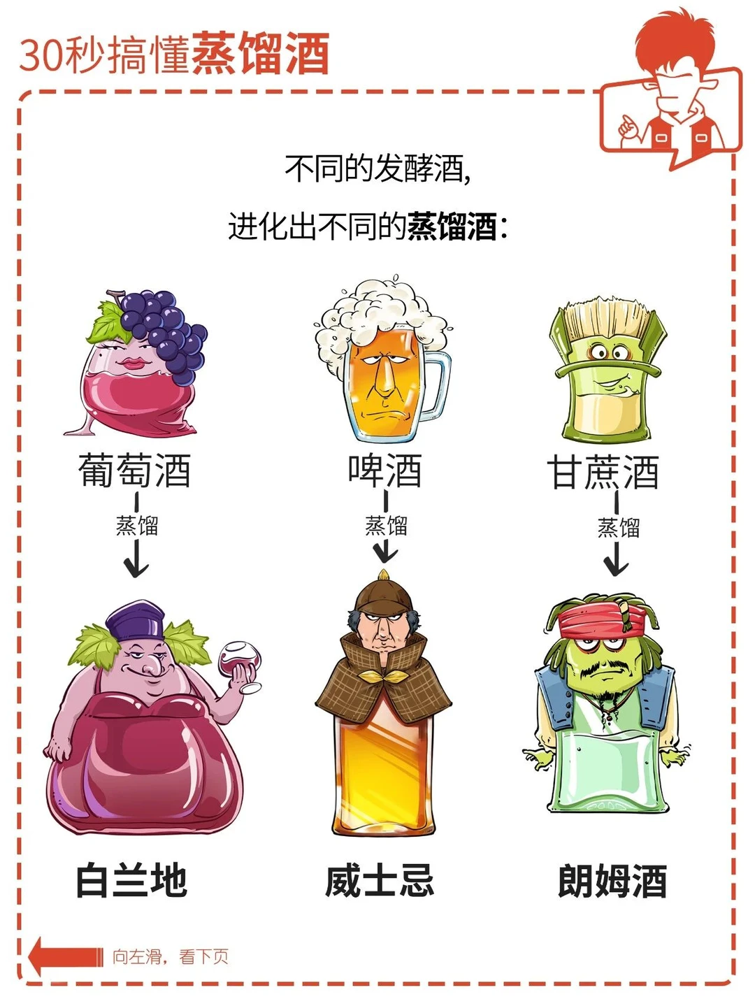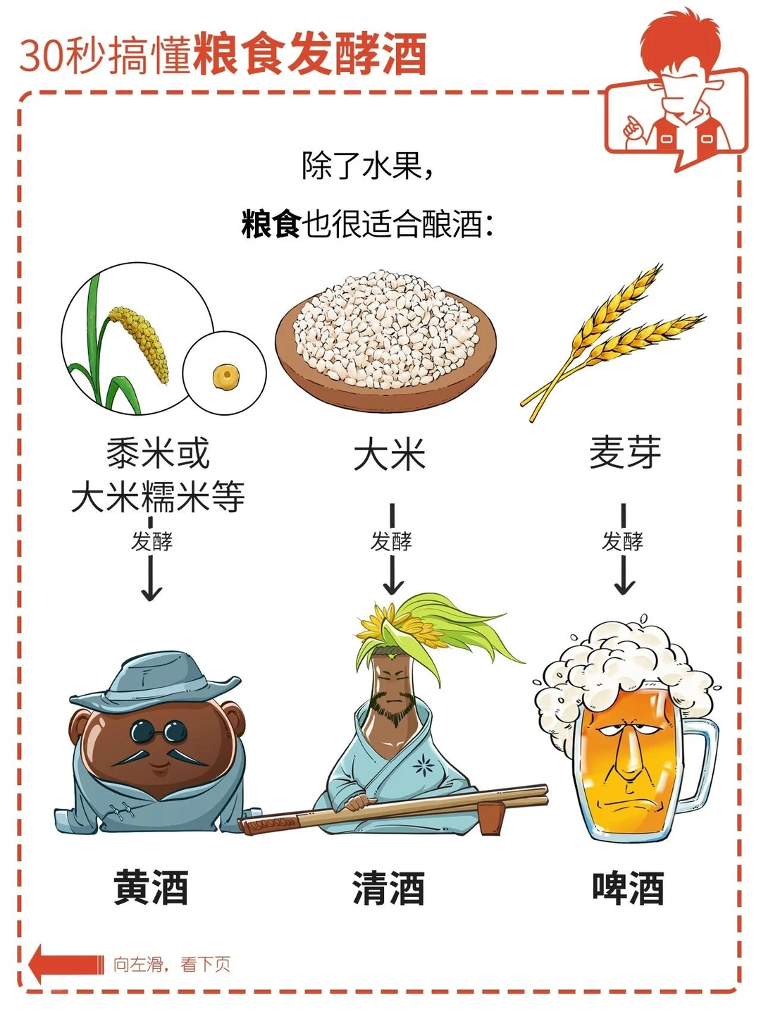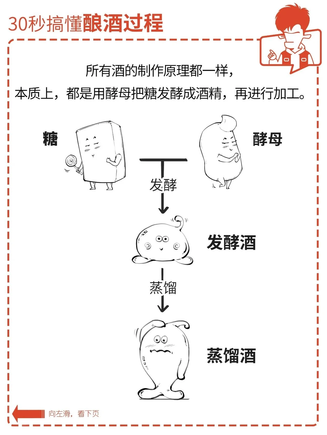 白酒、红酒、伏特加,啤酒、黄酒、白兰地,香槟、朗姆、威士忌…… 这么多酒,到底有啥不一样? 简单来说,所有酒的制作原理都一样, 本质上就干了一件事儿: 把植物里的糖发酵成酒精,再进行各种加工。 原料、酵母、酿造手法不同,造就了各种不同的酒。 只用 30 秒,混子哥带你速通各种类型的酒。