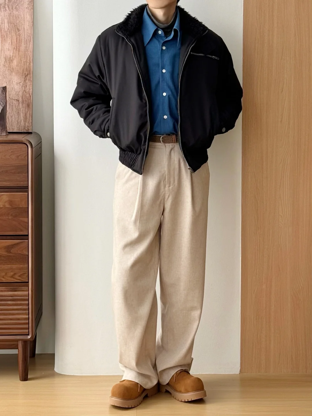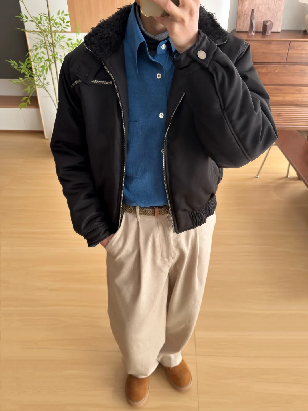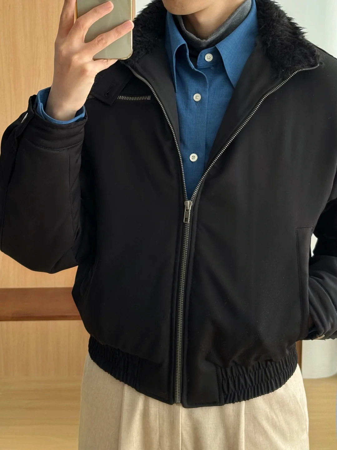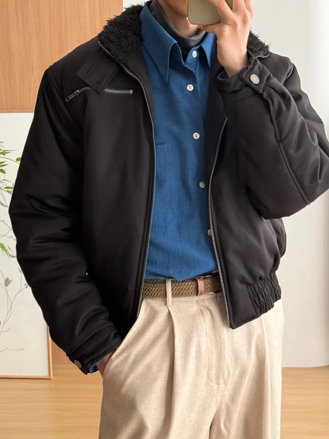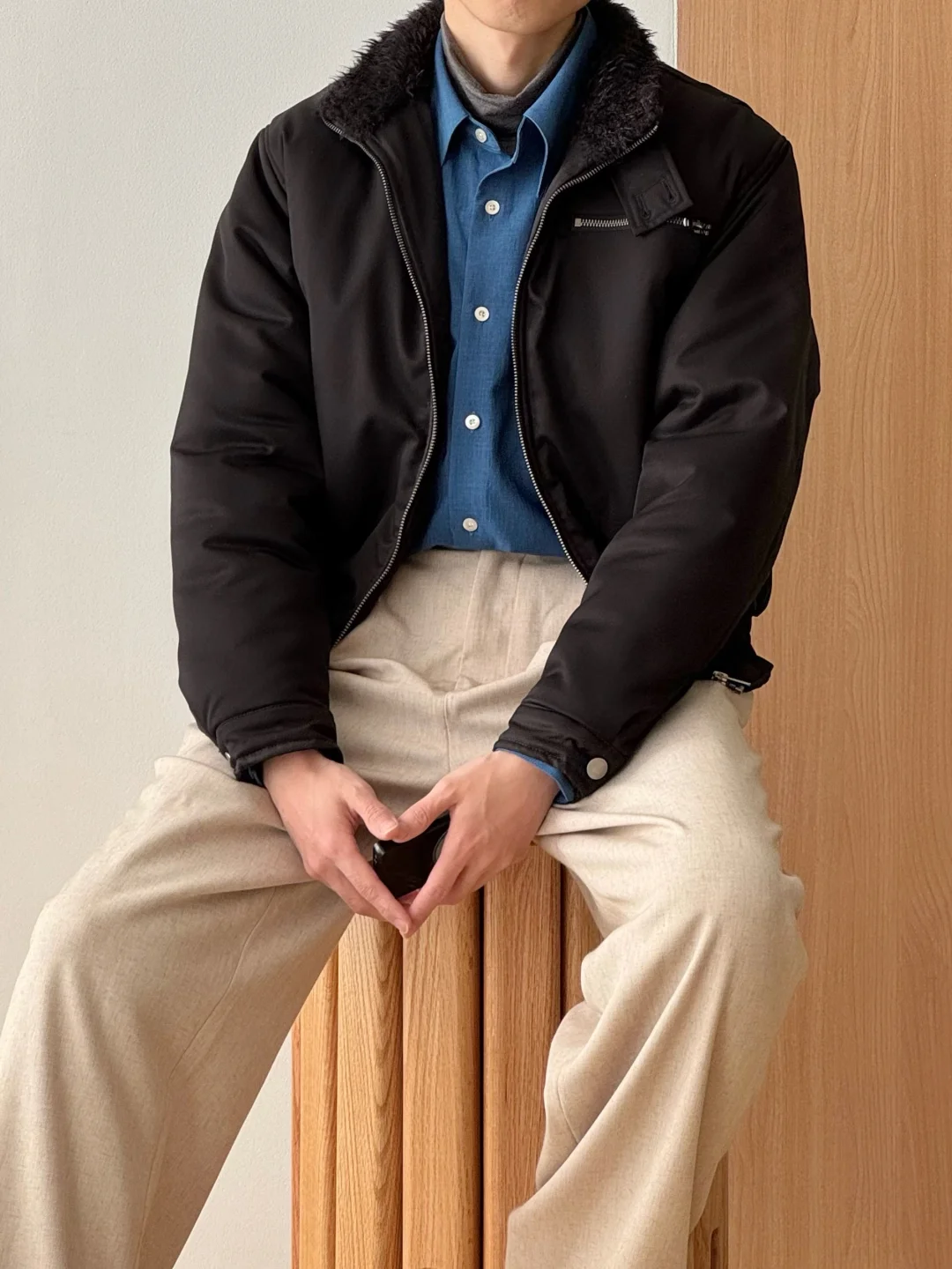 ·毛领暖暖,冬日安全感+1 ·短宽版型,利落显高[doge] ·靓丽蓝色衬衫作内搭,还蛮出效果 -