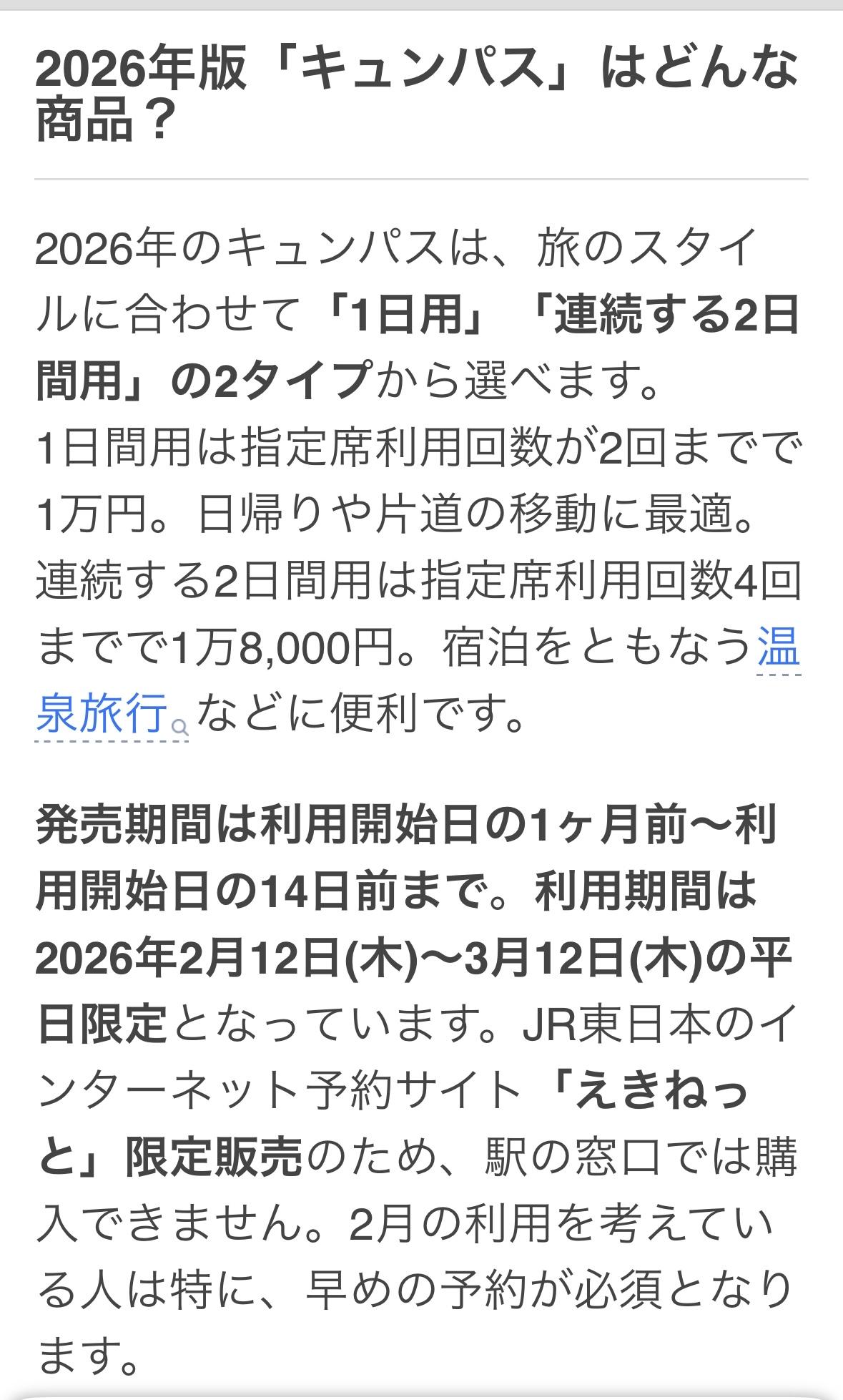 2026年的温泉通票有两种,一日通票和两日通票。一日通票售价1万日元,可乘坐指定席最多两次。两日通票售价1.8日元,可乘坐指定席最多四次。 1月12日开始出售的通票在网站Eki-net购买,提前14天至一个月购买。使用期限2026年2月12日至3月12日的平日。 适用线路包括JR东日本所有线路、青森铁道、岩手银河铁道、三陆铁道、北越特快线以及越后心跳铁道(直江津至新井)。新干线、特快列车和普通列车的自由席位可无限次使用。指定席位需提前预订,方可在普通车厢内使用指定席位,但使用次数有限制。(JR西日本的北陆新干线上越妙高至敦贺段不参与本次活动。)