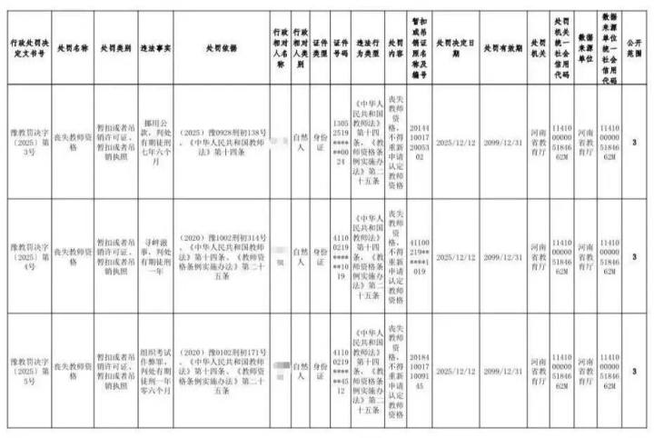 根据河南省教育厅公布的行政处罚详细信息,此次处理的五名教师问题性质分为两类: