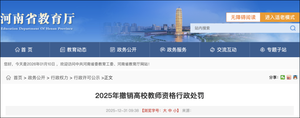据媒体11日报道,河南省教育厅于2025年12月31日正式发布《2025年撤销高校教师资格行政处罚》通告,依法对省内五名高校教师作出丧失或撤销教师资格的处理。