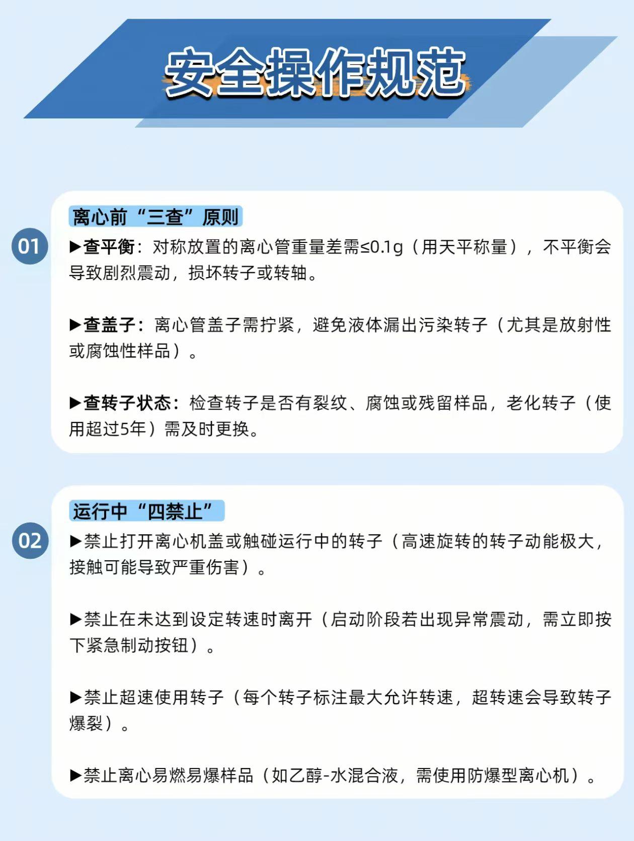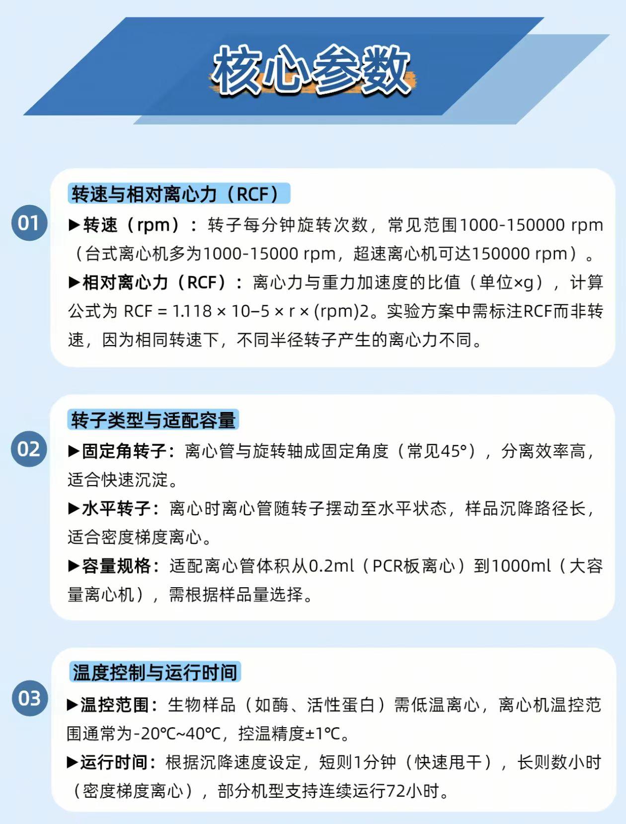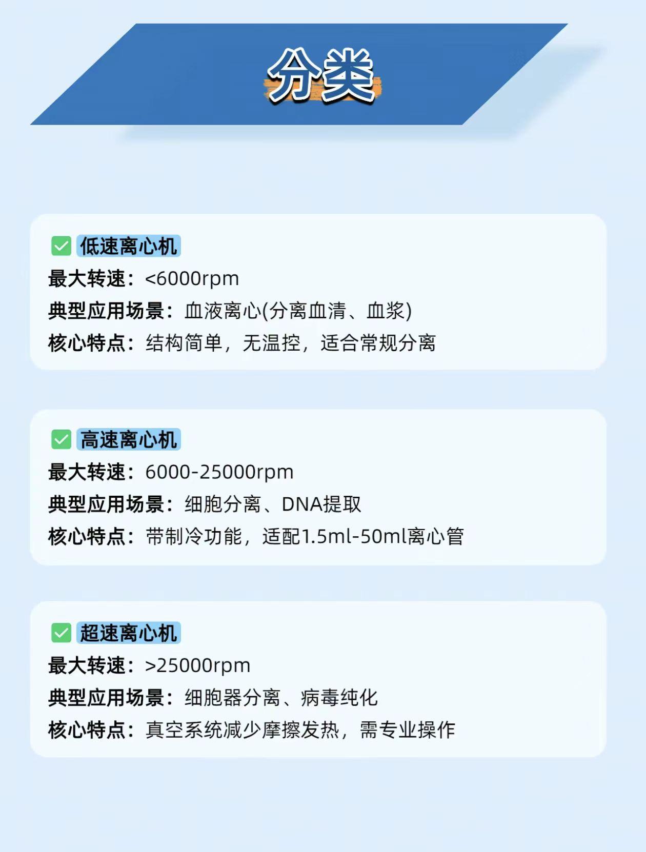 《实验室离心机震到转子坏?90% 是没做好这步!》 实验室里的离心机是 “固液分离快进键”—— 血液离血清、细胞离沉淀、DNA 离杂质,效率是自然沉降的几百倍!但 80% 的人都栽在 “平衡” 上:离心管重量差超 0.1g,开机直接震到转子裂,实验直接报废。 它的 “干活逻辑” 很简单: 靠高速旋转(最高 15 万 rpm)产生离心力,密度大、颗粒大的物质先沉降;分两种玩法: 差速离心:分步提转速,先离细胞碎片,再离细胞器; 密度梯度离心:铺蔗糖层,离出 DNA / 纳米颗粒的清晰条带。 关键坑别踩: 别只看转速!要看RCF(相对离心力)—— 相同转速下,转子半径不同,离心力能差几倍,实验方案标 RCF 才准。 保命操作规: 离心前 “三查”: 查平衡:对称管重量差≤0.1g(用天平称!); 查盖子:拧紧防漏液; 查转子:没裂纹、没残留样。 运行中 “四不”:不开盖、不离开、不超速、不离心易燃易爆样。 它管的都是实验生死线: 医学:3000rpm 离 5 分钟,分出血清测血常规; 分子生物:12000rpm+4℃离 10 分钟,沉淀 DNA 去蛋白杂质; 材料:超速离心分 50nm/100nm 的金纳米颗粒。 你离心时遇过转子震动、液体漏出来的情况吗?评论区聊聊~😉