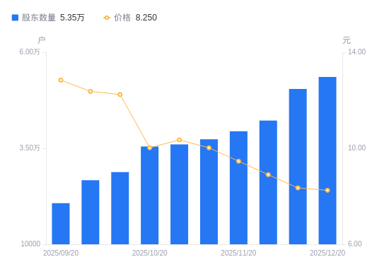 日期A股户数(户)流通A股户均持股数(股)户均持股市值(万元)2025-12-205354617183.0614.182025-12-105044618238.9915.232025-11-284223721783.8419.392025-11-203942323338.7622.082025-11-103734924634.7724.682025-10-313598925565.7026.462025-10-203545625950.0226.002025-10-102879631951.8039.112025-09-302670434454.9142.622025-09-202070144446.3657.07