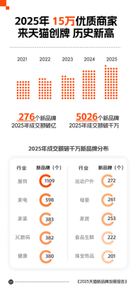 上证报中国证券网讯(记者杨翔菲)1月12日,天猫发布《2025年度新品牌发展报告》:过去一年,超15万个优质新商家来天猫创牌,规模创历史新高。开店当年成交额破亿元的品牌数量同比增长超40%;开店3年的新品牌当中,276个年成交额破亿元,5026个年成交额破千万元,各项数据均创历史新高。