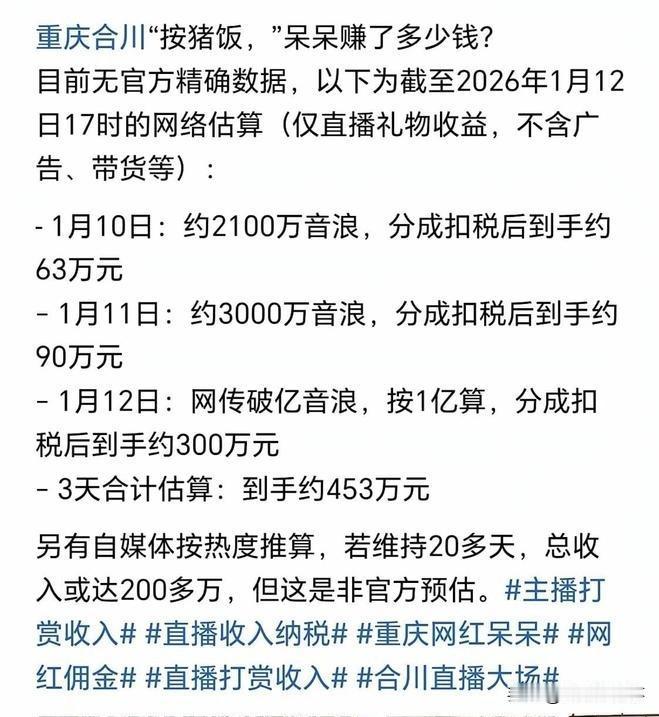 泼天的富贵突如其来,呆呆彻底愣住了,顷刻间摇身一变成为百万小富婆。23岁的她兴奋至极,一时竟不知所措。 年纪轻轻便能躺平了,三天的刨猪汤直播,收获百万粉丝,挣到了普通人几辈子都难以企及的财富。现代社会就是如此,有时你殚精竭虑、终日操劳或许仅能糊口,而有些人却在不经意间赚得盆满钵满。 有细心的网友算了算,短短几天,呆呆进账可达数百万元。面对这笔横财,你是心生羡慕,还是暗自嫉妒呢?