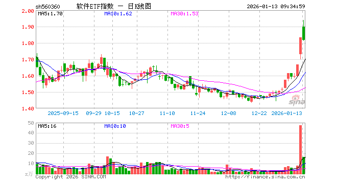 1月13日,软件ETF指数(560360)开盘涨3.66%,报1.900元。软件ETF指数(560360)重仓股方面,科大讯飞开盘涨2.38%,同花顺涨1.69%,金山办公涨3.93%,指南针涨1.47%,恒生电子涨2.90%,润和软件涨0.84%,三六零涨3.30%,拓维信息涨0.03%,用友网络涨4.12%。