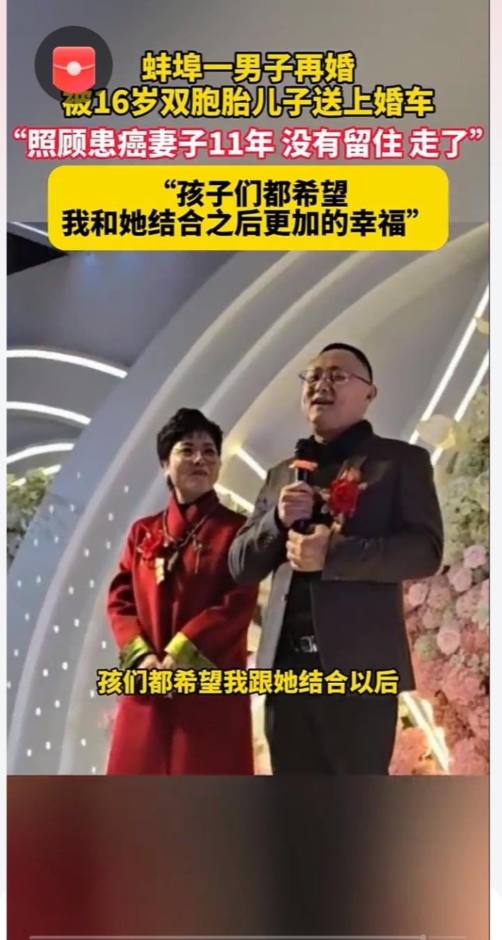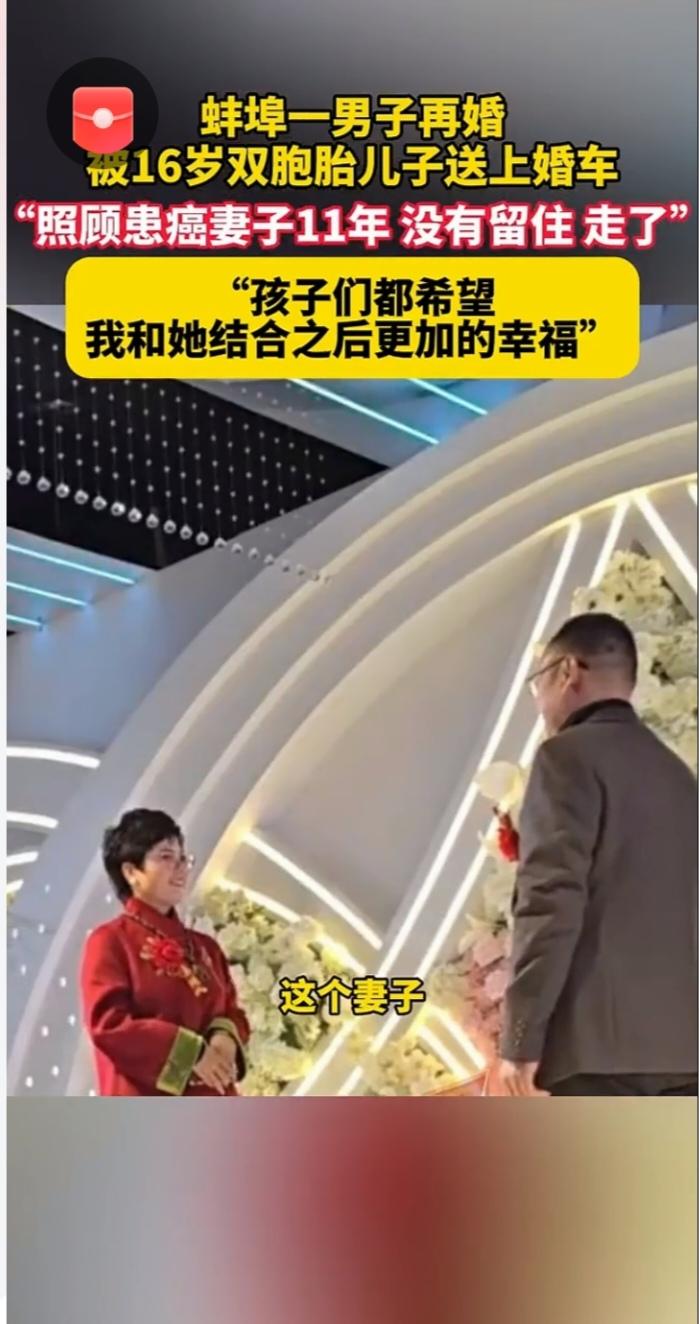 蚌埠16岁双胞胎送父再婚:11年风雨后,爱与理解续写团圆 “爸,新婚快乐!以后我们一起守护这个家!”2026年1月12日,安徽蚌埠的寒风中,一对身形酷似的16岁少年并肩而立,将手中的鲜花递到父亲刘先生手中,目送婚车缓缓驶向暖阳深处。这一幕没有狗血的抵触,只有跨越岁月的体谅,在社交平台刷屏无数。 时光回溯到2011年,双胞胎尚在襁褓,母亲便被确诊恶性肿瘤。此后11年,抗癌路上的煎熬与生活的重压交织,刘先生既当爹又当妈,把两个儿子拉扯长大。深夜的急诊单、作业本上的签名、家长会的身影,他用沉默的坚守撑起一片天,直到妻子带着不舍离世。 命运的转机藏在日常的温柔里。现任妻子的出现,没有打破兄弟俩熟悉的生活,反而用细腻的关怀填补了空缺。清晨温热的早餐、换季整齐的衣物、考试失利后的耐心开导,她用“视如己出”的真心,悄悄融化了单亲家庭的隔阂。“她从不说刻意讨好的话,却把我们的喜好记得比谁都清楚。”双胞胎的话语里满是认可。 当刘先生犹豫着说出再婚的想法时,两个少年的回应格外坚定:“爸,我们早就把她当家人了,你该拥有幸福。”婚车上,刘先生望着后视镜里挥手的儿子,眼眶泛红;车外,兄弟俩相视一笑,眼中是对父亲的祝福,也是对新家的期许。 “最长情的守护是成全,最温暖的亲情是理解”,网友的评论道出真谛。有人留言:“这对双胞胎太懂事了,继母的付出终获真心,这才是重组家庭最好的模样”,也有人感慨:“11年风雨同舟,如今爱有延续,愿往后皆是坦途”。 岁月无常,却总有温柔接住遗憾。这场跨越伤痛的再婚,没有血缘的羁绊,却有真心的相守,让我们看见:最好的家庭,从来不是完美无缺,而是用爱与理解,把生活过成彼此都安心的模样。南京双胞胎男孩 带个男孩再婚