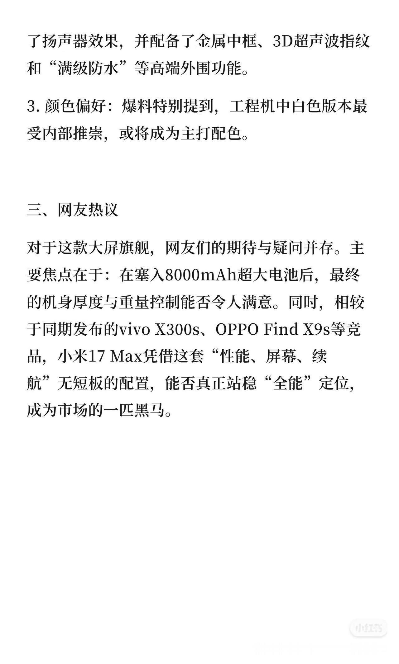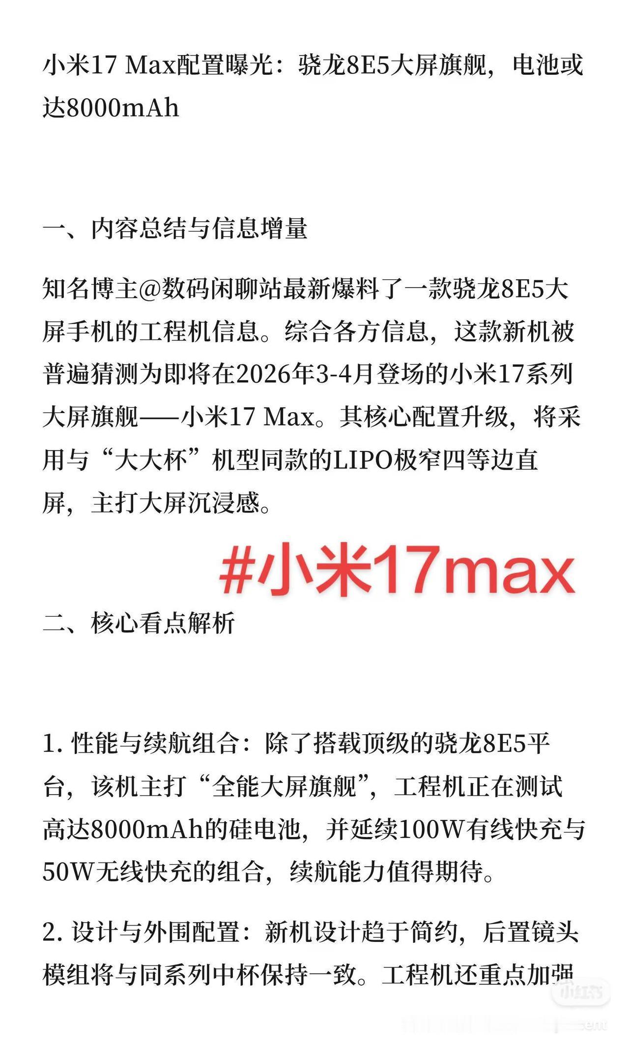 小米17 Max配置曝光:骁龙8E5大屏。小米17 Max配置曝光:骁龙8E5大屏旗舰,电池或达8000mAh一、内容总结与信息增量知名博主@数码闲聊站最新爆料了一款骁龙8E5大屏手机的工程机信息。综合各方信息,这款新机被普遍猜测为即将在2026年3-4月登场的小米17系列大屏旗舰——小米17 Max。其核心配置升级,将采用与“大大杯”机型同款的LIPO极窄四等边直屏,主打大屏沉浸感。二、核心看点解析1. 性能与续航组合:除了搭载顶级的骁龙8E5平台,该机主打“全能大屏旗舰”,工程机正在测试高达8000mAh的硅电池,并延续100W有线快充与50W无线快充的组合,续航能力值得期待。2. 设计与外围配置:新机设计趋于简约,后置镜头模组将与同系列中杯保持一致。工程机还重点加强了扬声器效果,并配备了金属中框、3D超声波指纹和“满级防水”等高端外围功能。3. 颜色偏好:爆料特别提到,工程机中白色版本最受内部推崇,或将成为主打配色。三、网友热议对于这款大屏旗舰,网友们的期待与疑问并存。主要焦点在于:在塞入8000mAh超大电池后,最终的机身厚度与重量控制能否令人满意。同时,相较于同期发布的vivo X300s、OPPO Find X9s等竞品,小米17 Max凭借这套“性能、屏幕、续航”无短板的配置,能否真正站稳“全能”定位,成为市场的一匹黑马。