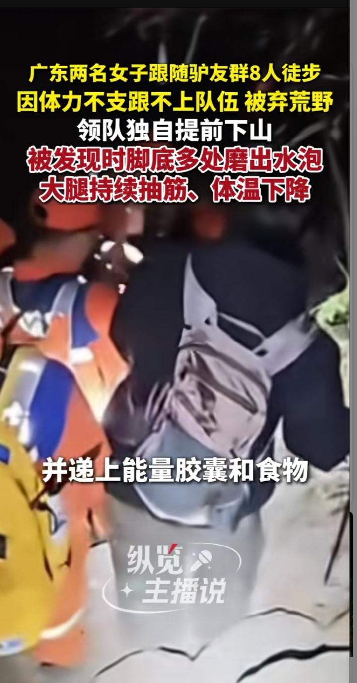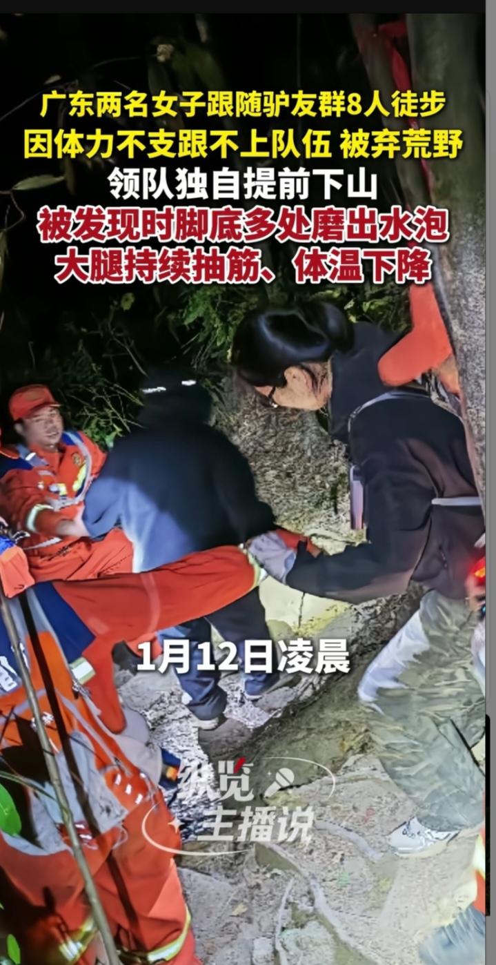 两女子随驴友群徒步罗浮山被困 消防连夜救援 2026年1月11日,广东两名女子跟随8人驴友群,从罗浮山野路出发计划反穿画鱼线至飞云顶。途中二人因体力不支掉队,领队竟独自提前下山,致二人滞留荒野。 惠州朱明洞消防救援站接警后,迅速出动5名指战员携急救物资进山搜救。救援人员克服夜间山地复杂地形等困难,为被困女子处理水泡、补充能量、保暖舒缓抽筋。12日凌晨1时30分许,二人被安全护送下山,目前体征平稳。 消防部门提醒,户外徒步需评估自身体力,选择正规路线,组织者也应尽安全保障义务,不能一走了之!
