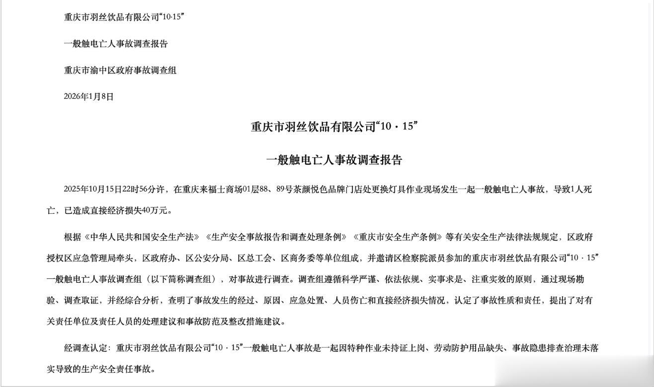 报告显示,2025年10月15日晚,重庆来福士商场内的茶颜悦色门店在更换灯具作业时发生触电亡人事故,一名施工人员经抢救无效死亡。羽丝饮品公司(茶颜悦色品牌门店管理公司)因安全监管缺位对事故负有责任,建议行政处罚。