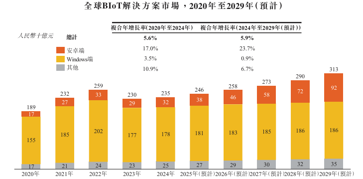 根据灼识咨询的资料,按2024年的收入计,该公司目前是全球最大的安卓端BIoT解决方案提供商,占有10%以上的市场份额。根据同一资料来源,预期安卓端BIoT解决方案市场将于未来五年出现爆发式增长。